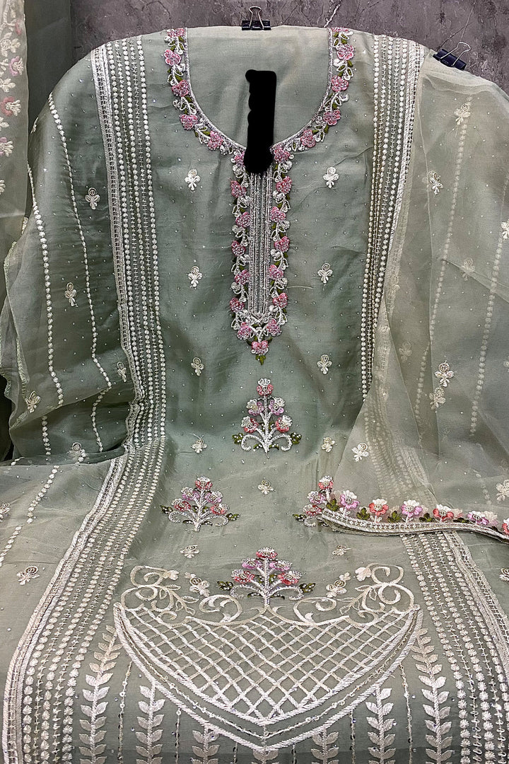 This pista-colored Pakistani salwar kameez features detailed handwork on heavy organza fabric, complemented by an organza dupatta for a graceful traditional ensemble.