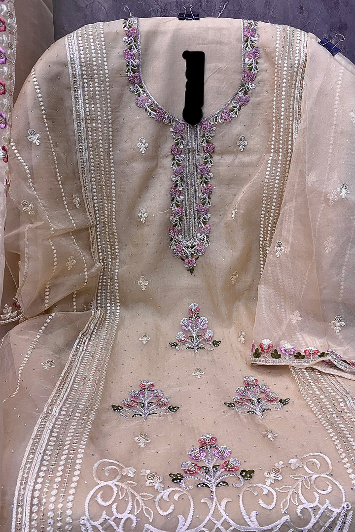 This light peach Pakistani salwar kameez features detailed handwork on heavy organza fabric, paired with an organza dupatta for a stylish traditional outfit.