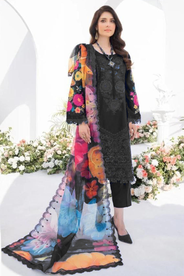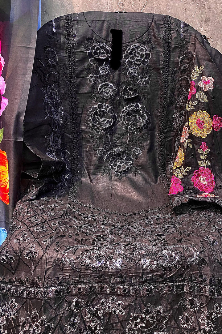 This Pakistani Salwar Kameez is expertly crafted with black cotton and adorned with intricate embroidery, paired with an imported silk chex dupatta.