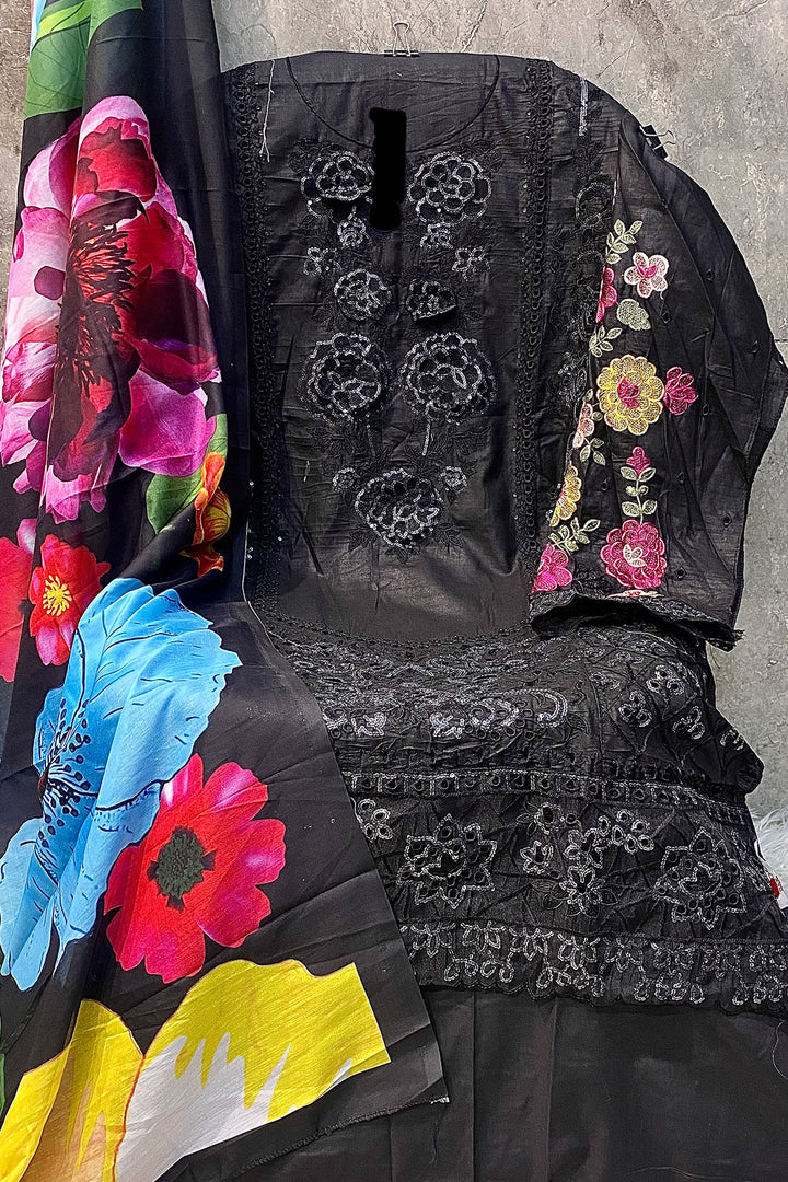 Black Cotton Pakistani Salwar Kameez Embroidered With Imported Silk Chex Dupatta