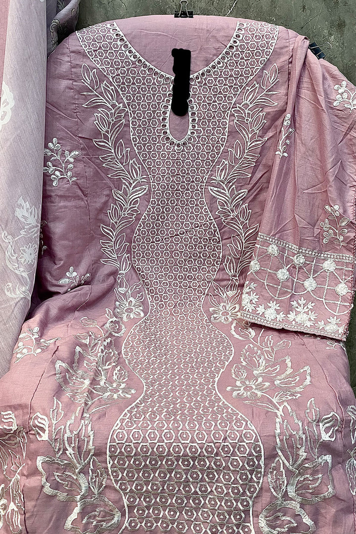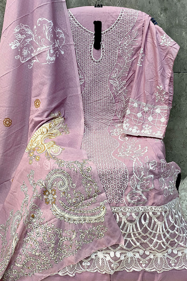 This elegant pink rayon Pakistani salwar suit features a long design paired with a beautifully printed cotton dupatta, combining comfort with traditional style.
