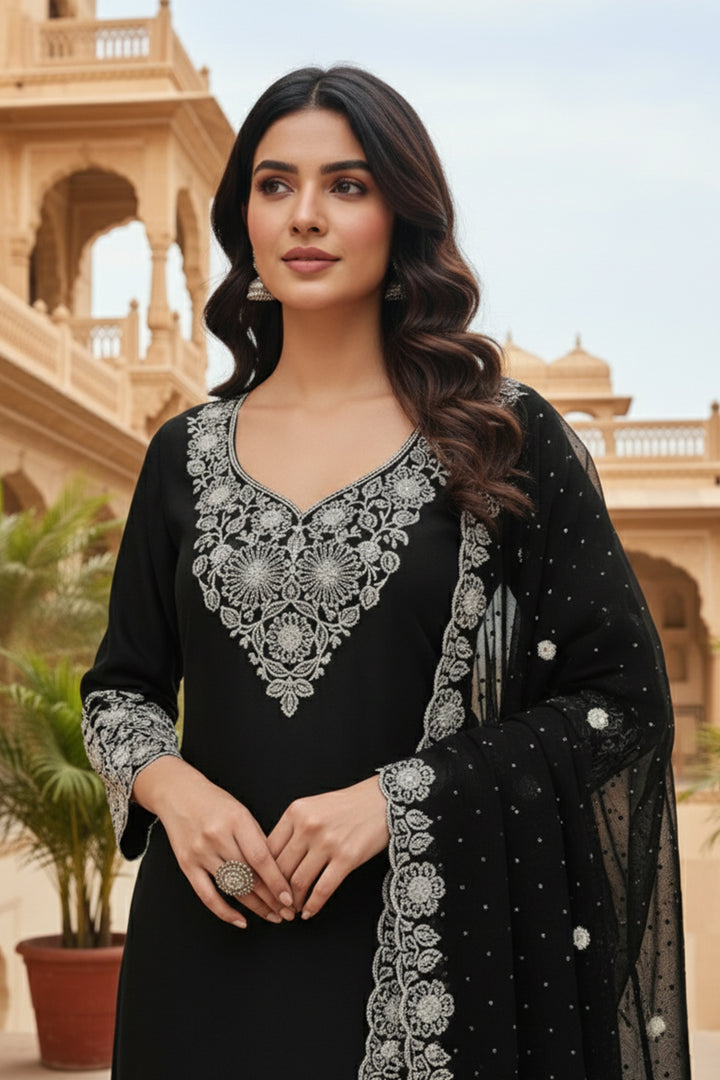 This ready-to-wear black Chikankari salwar kameez features traditional Pakistani craftsmanship, paired with a lightweight georgette dupatta for a complete festive look.