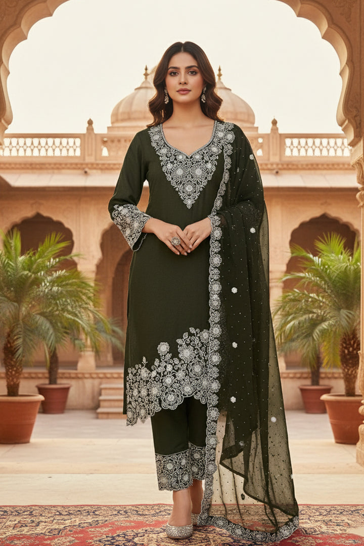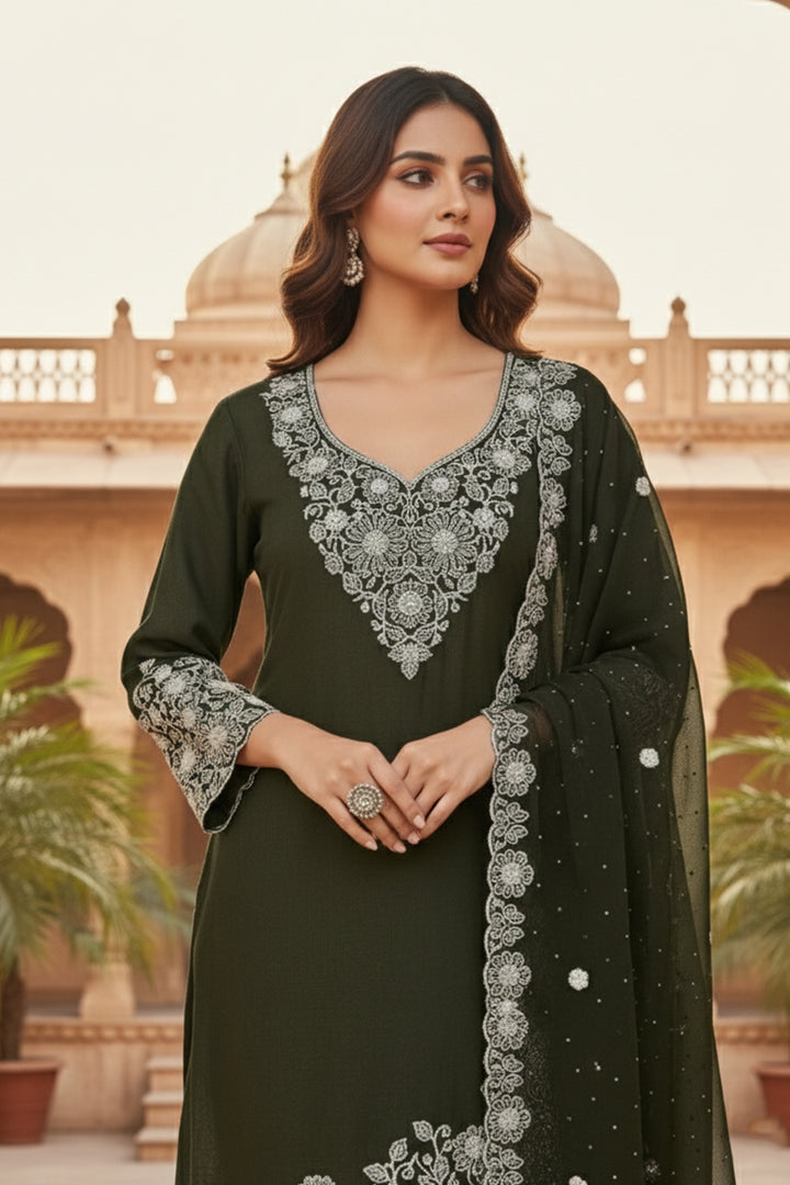This ready-made Mehndi-colored Chikankari salwar kameez includes a matching georgette dupatta, perfect for festive occasions.