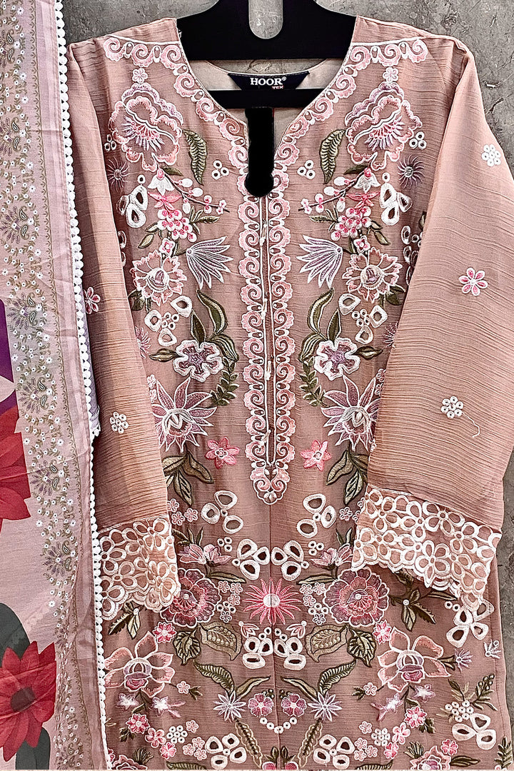 Full Stitched Chiku Chiffon Embeoidered Pakistani Salwar Kameez With Cotton Printed Dupatta