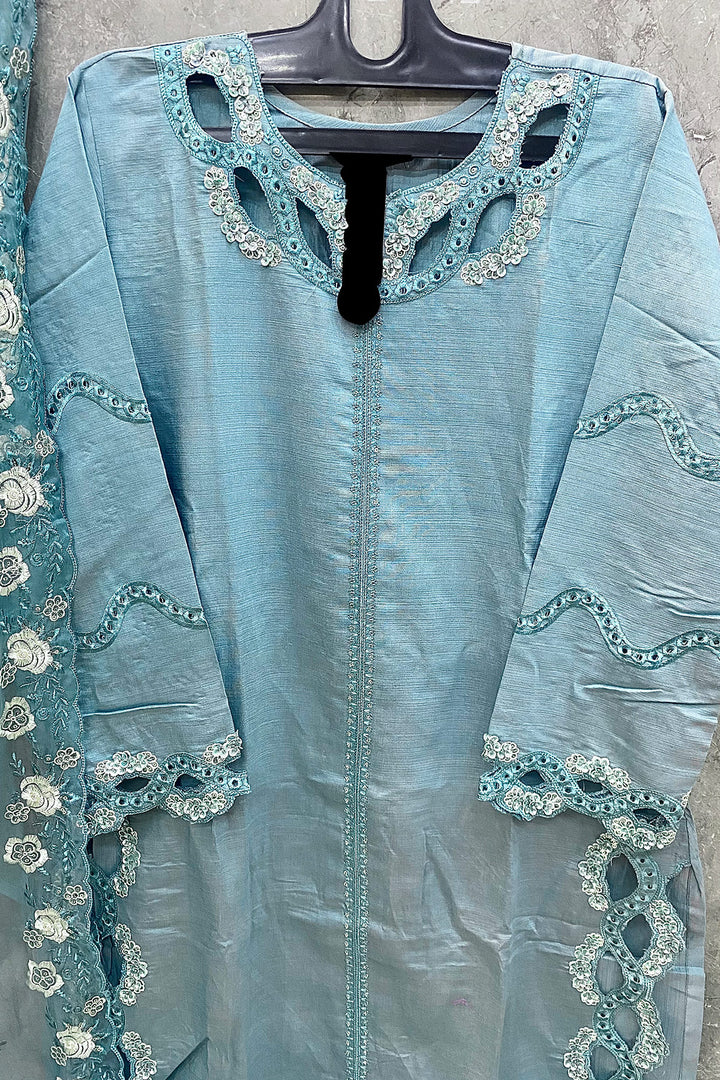 This teal blue Pakistani salwar kameez features full stitching with crystal viscose cut work and comes with a delicate organza dupatta, combining elegance and comfort.