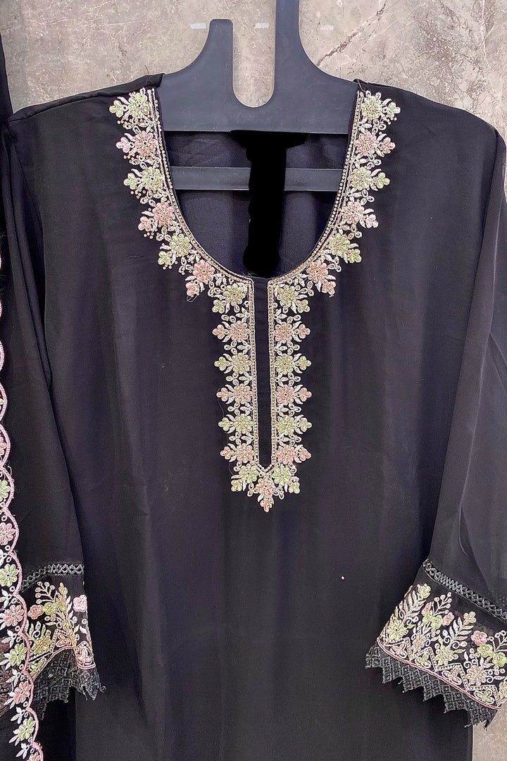This fully stitched black georgette outfit features intricate embroidered moti work, complemented by an exquisitely designed dupatta, offering a sophisticated and elegant ensemble.