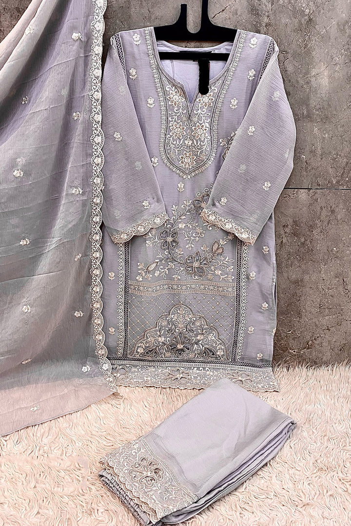 This light purple Pakistani salwar kameez is fully stitched in a tunic style using heavy chiffon fabric. It comes complete with a matching dupatta for a coordinated, elegant look.