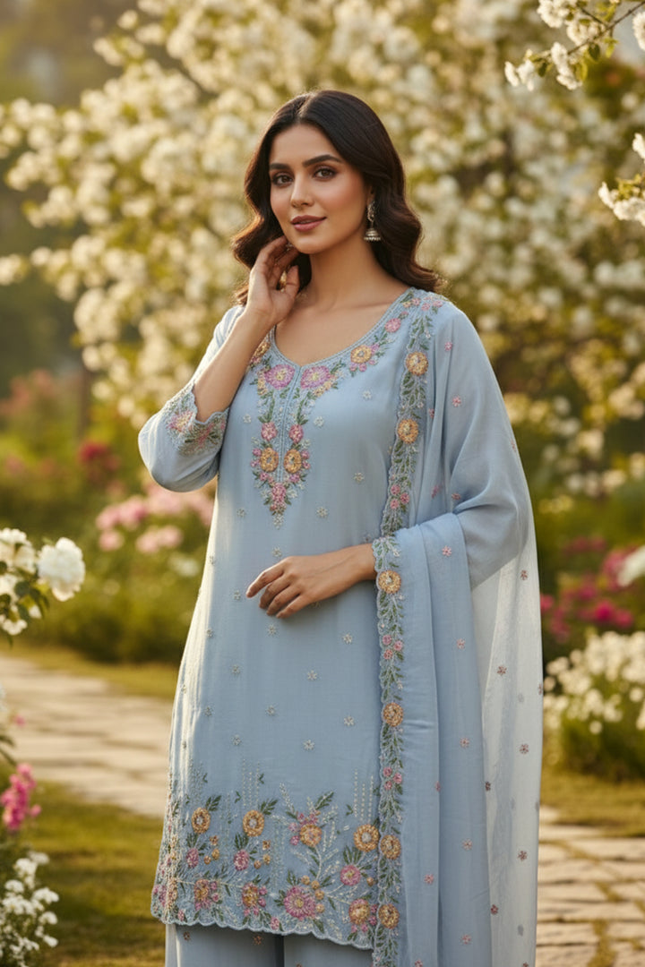 Elegant ice blue Pakistani salwar kameez crafted from premium heavy chiffon with a flattering palazzo silhouette. This fully stitched ensemble includes a matching chiffon dupatta, perfect for weddings, celebrations, or formal occasions. The luxurious fabric drapes beautifully while maintaining its shape, offering both comfort and sophistication for the discerning wearer.