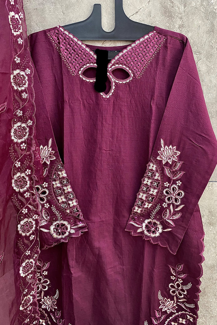 This fully stitched deep purple Pakistani tunic is crafted from crystal viscose and complemented by an organza dupatta, highlighting refined detailing and sophisticated style.