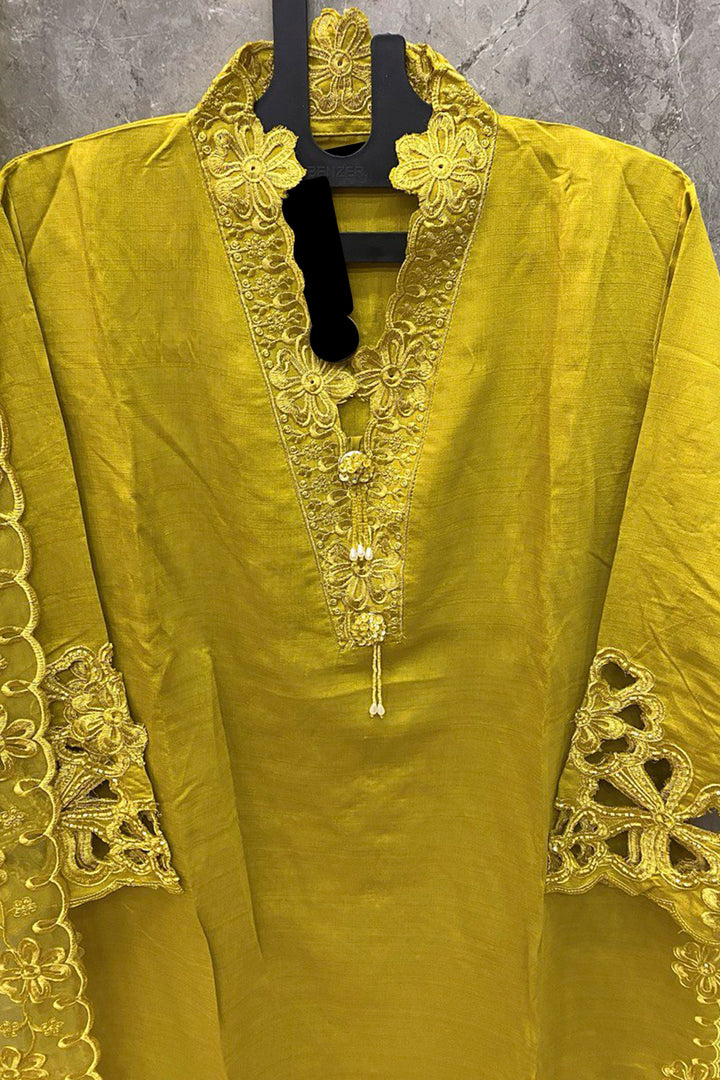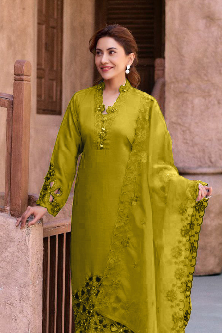 Fully Stitched Pakistani Lemon Salwar Kameez Crystal Viscose With Organza Dupatta Work