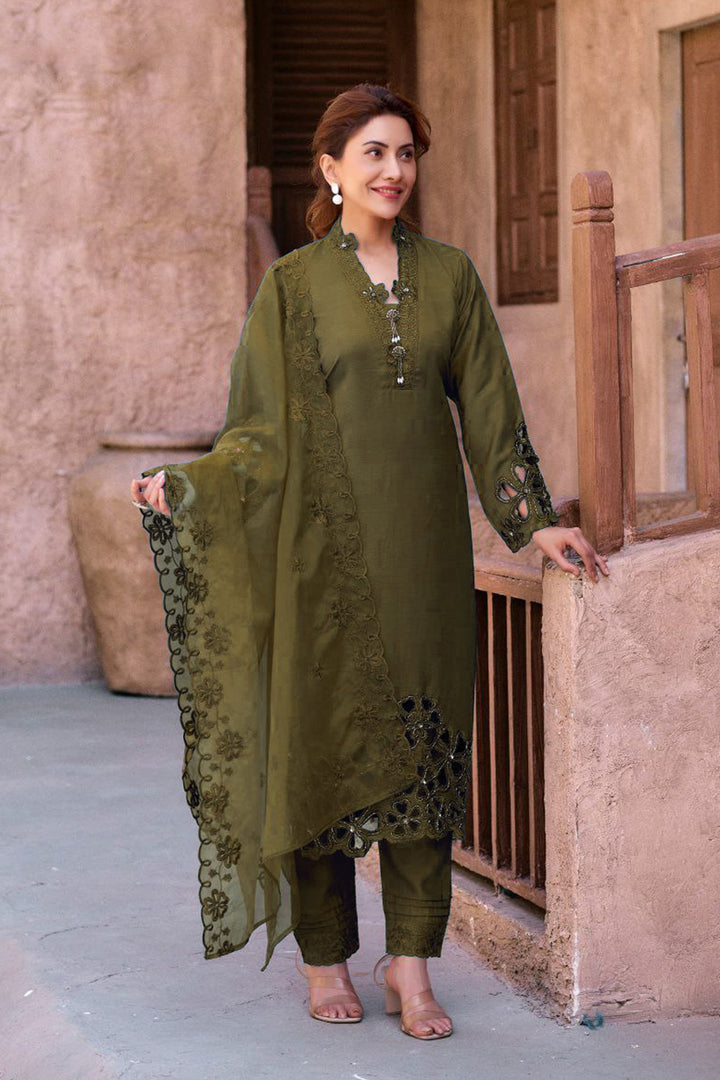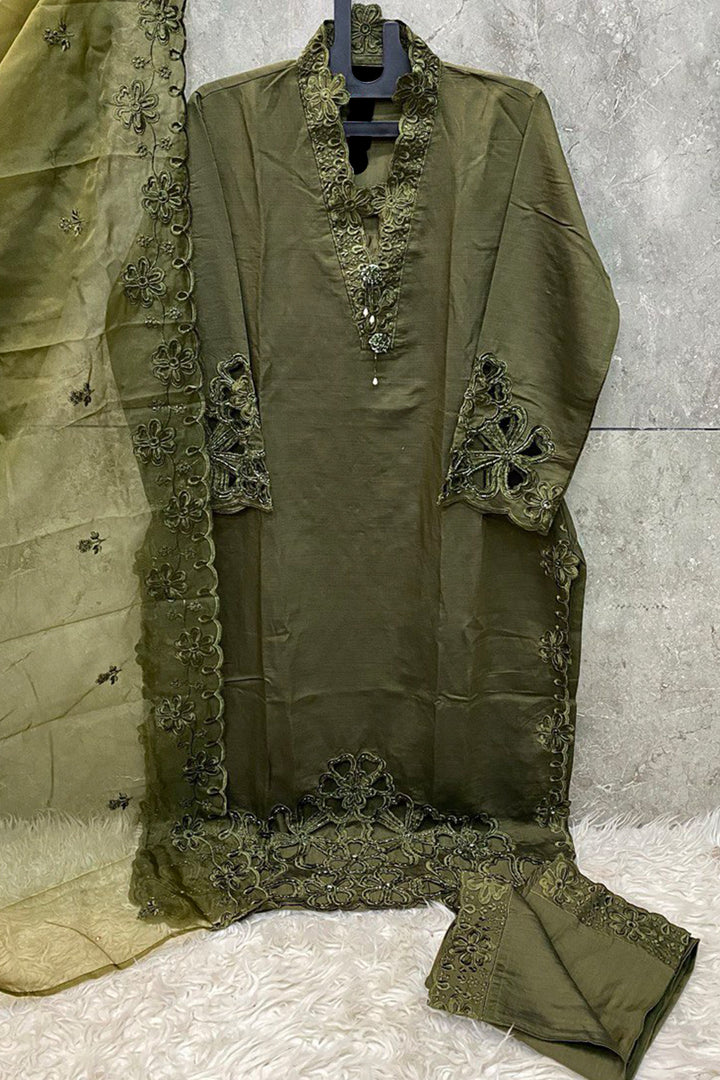 Fully Stitched Pakistani Mehndi Salwar Kameez Crystal Viscose With Organza Dupatta Work