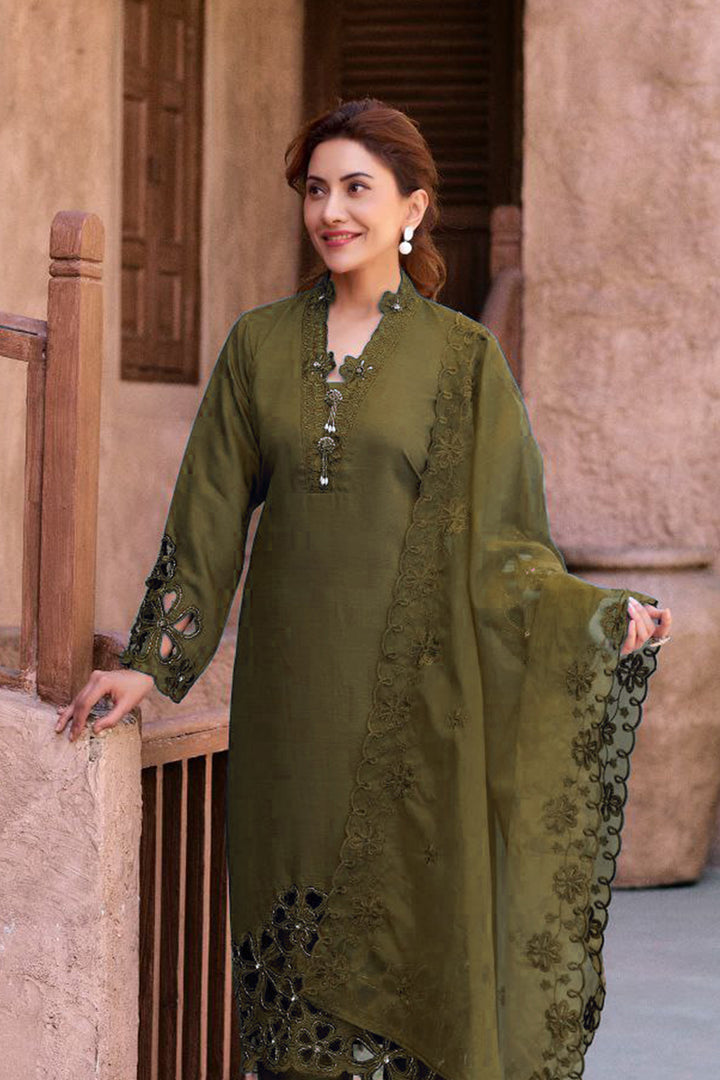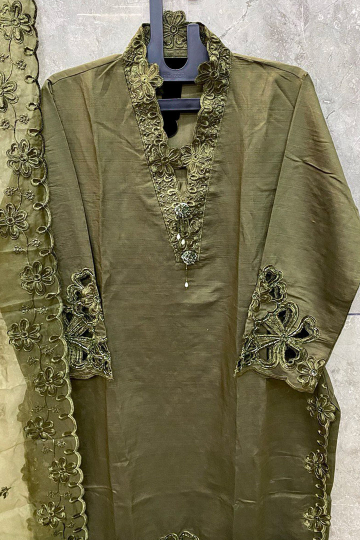 Expertly Stitched Pakistani Mehndi Salwar Kameez Made of Crystal Viscose and Featuring an Organza Dupatta Design.