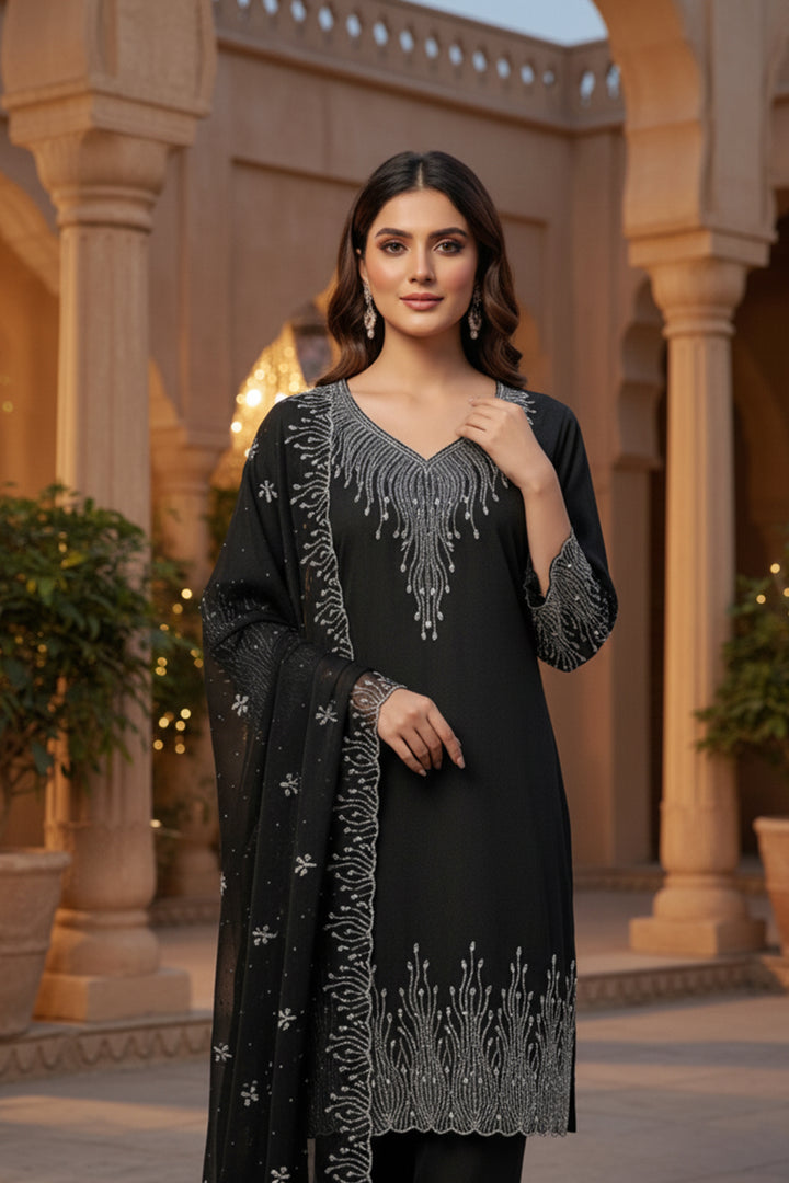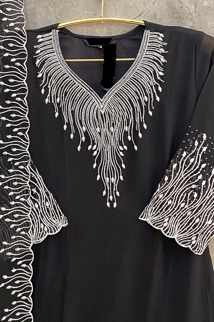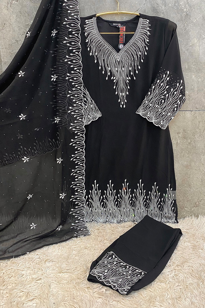 Black Pakistani salwar kameez set in georgette fabric with matching dupatta. Ready to wear for a classic, elegant look.