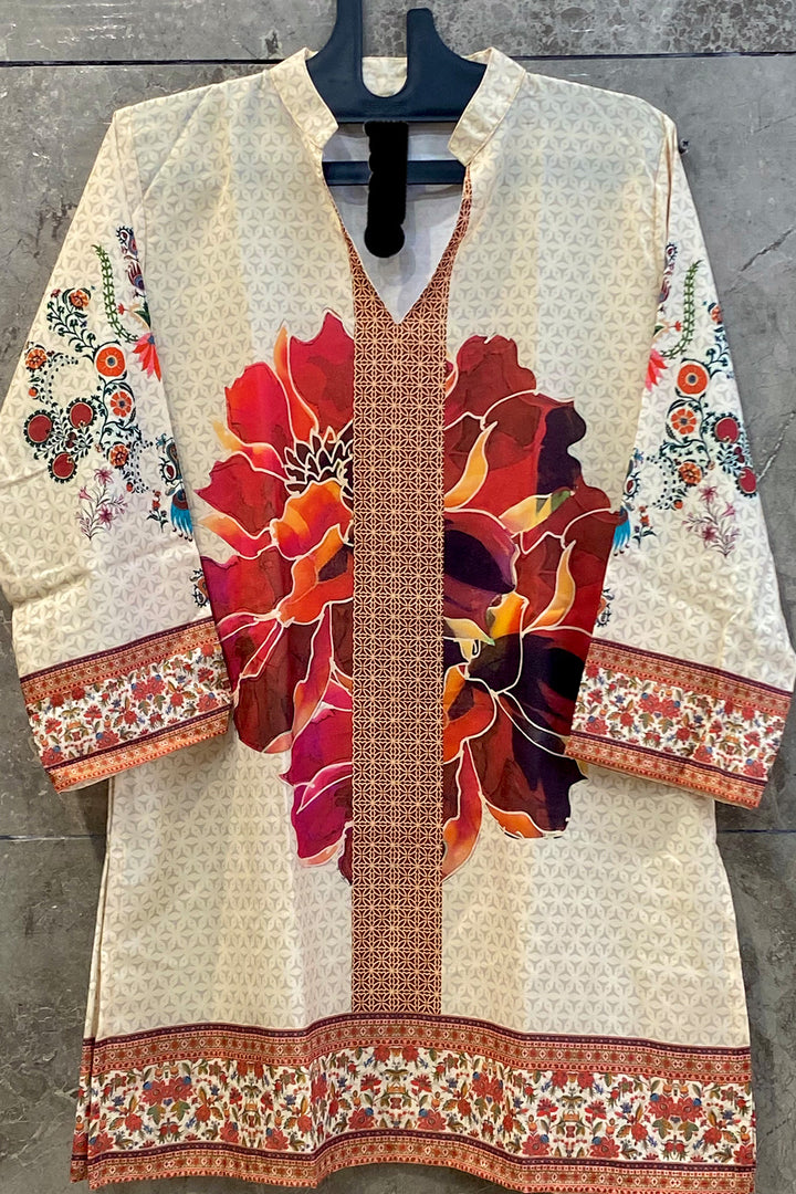 Luxurious Cream & Red Floral Printed Pakistani Cotton Kurti With Palazzo Co-Ord Set