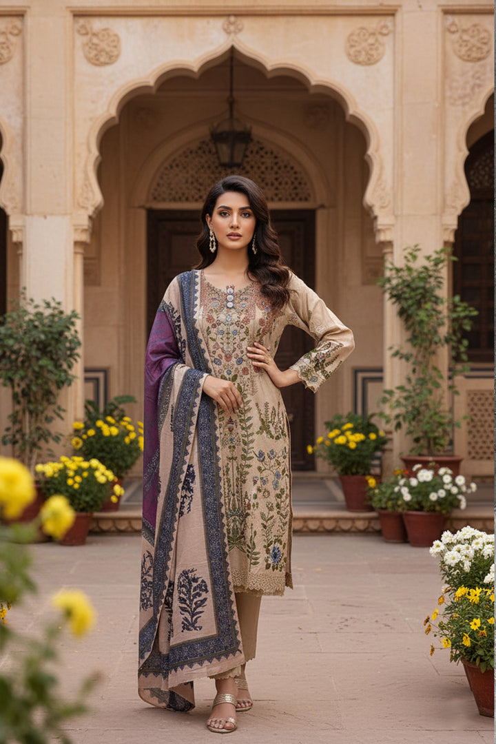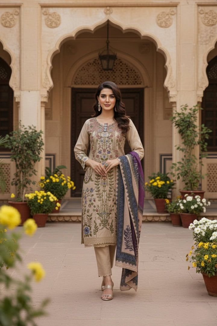 This embroidered Pakistani salwar kameez from the Luxury Rayon Collection includes a comfortable cotton printed dupatta, offering a blend of style and breathability.
