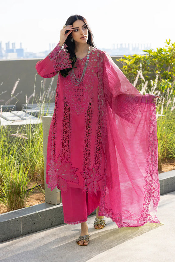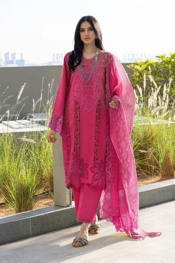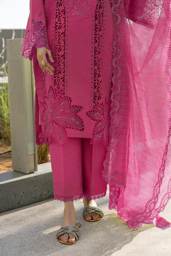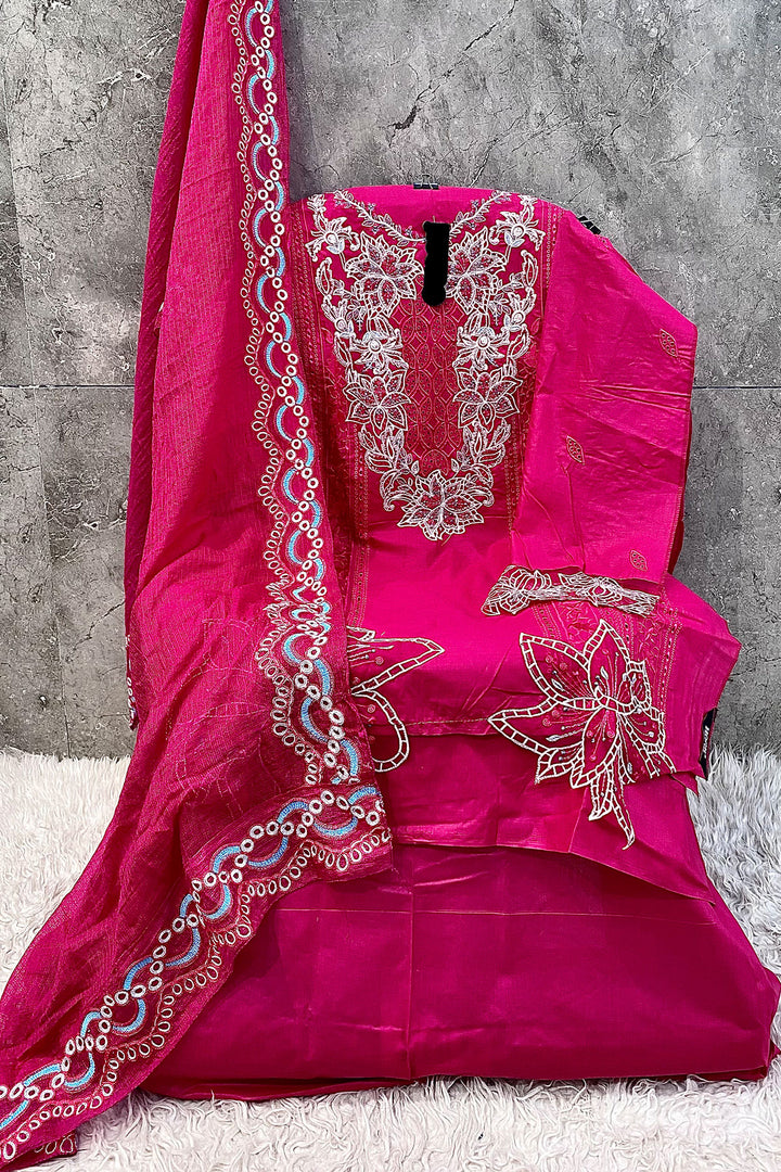This magenta Pakistani salwar kameez features elegant embroidery and comes with a stylish imported chex dupatta, perfect for traditional occasions.