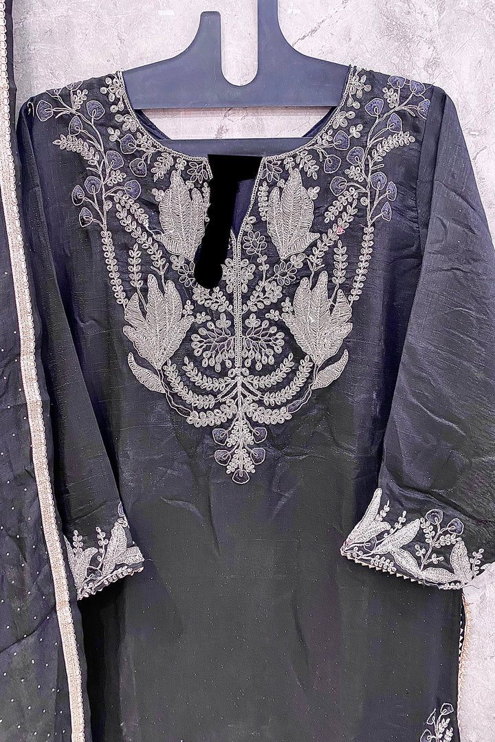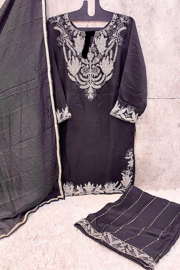 Elevate your wardrobe with this Pakistani Luxury Sharara Palazzo Set, featuring intricate design work on both the front and back in classic black, complemented by a delicate Chinon dupatta.