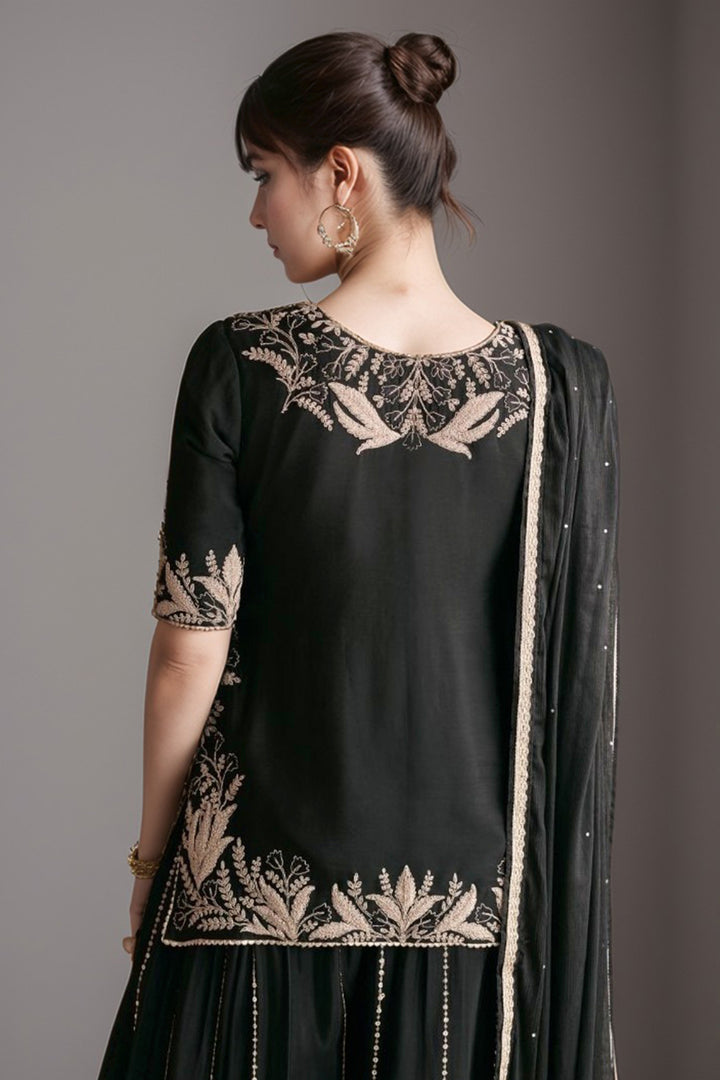Pakistani Luxury Sharara Palazzo Set – Black Front & Back Design Work With Chinon Dupatta