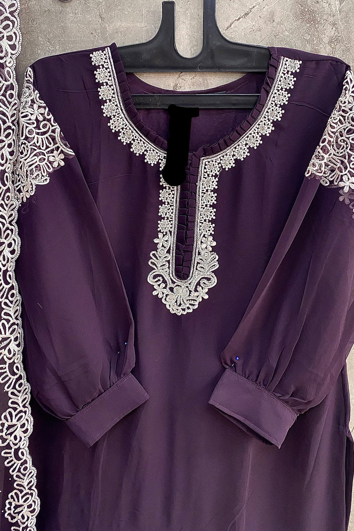 This Pakistani ready-to-wear dark purple salwar kameez features a tunic-style design crafted from georgette fabric, complemented by a matching georgette dupatta with intricate work.
