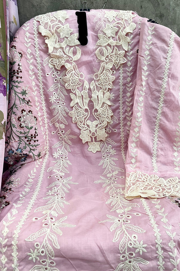 This light pink Pakistani salwar kameez is made from heavy cotton and comes with a printed cotton dupatta, offering comfort and style in one set.