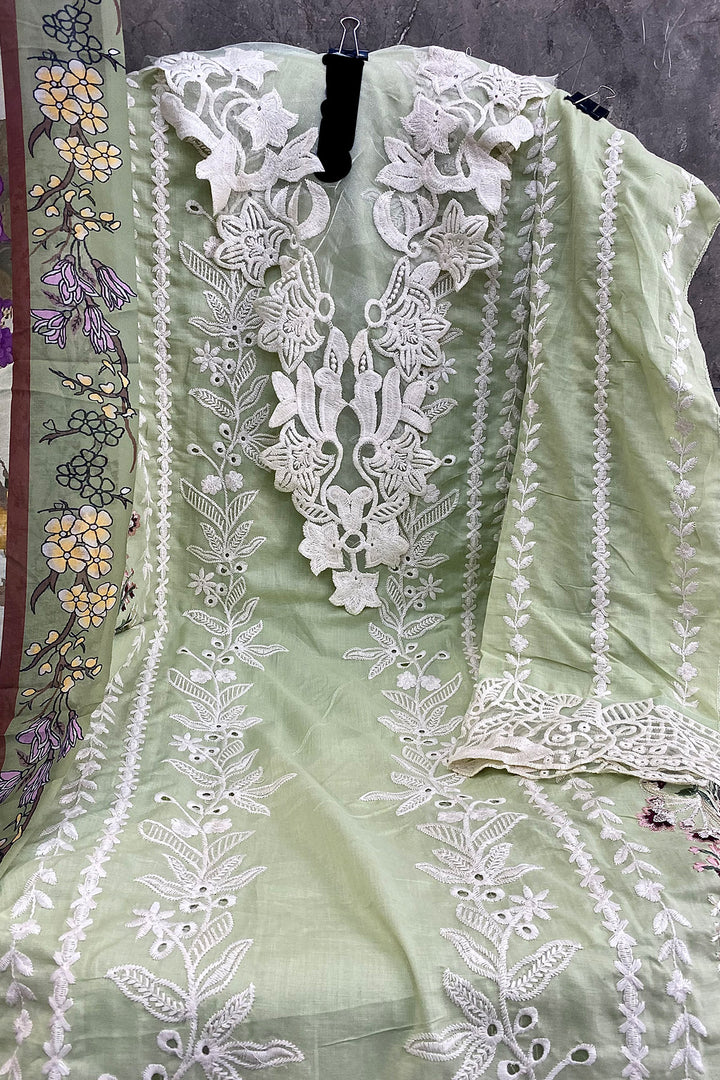 Pakistani Salwar Kameez Heavy Cotton Pista WIth Cotton Printed Dupatta