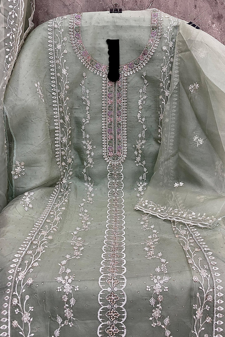 Partywear Mint Green Organza Pakistani Salwar Kameez With Delicate Khatli Embroidery Dupatta
