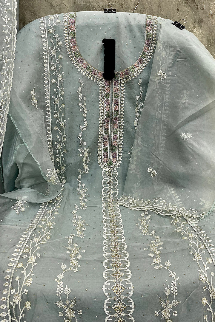 Partywear Sky Green Organza Pakistani Salwar Kameez With Delicate Khatli Embroidery Dupatta