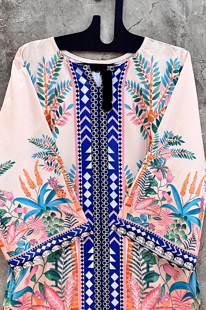This Peach & Blue Pakistani Co-Ord Palazzo Set features a printed rayon satin fabric, combining style and comfort for women. Ideal for elegant yet relaxed occasions.