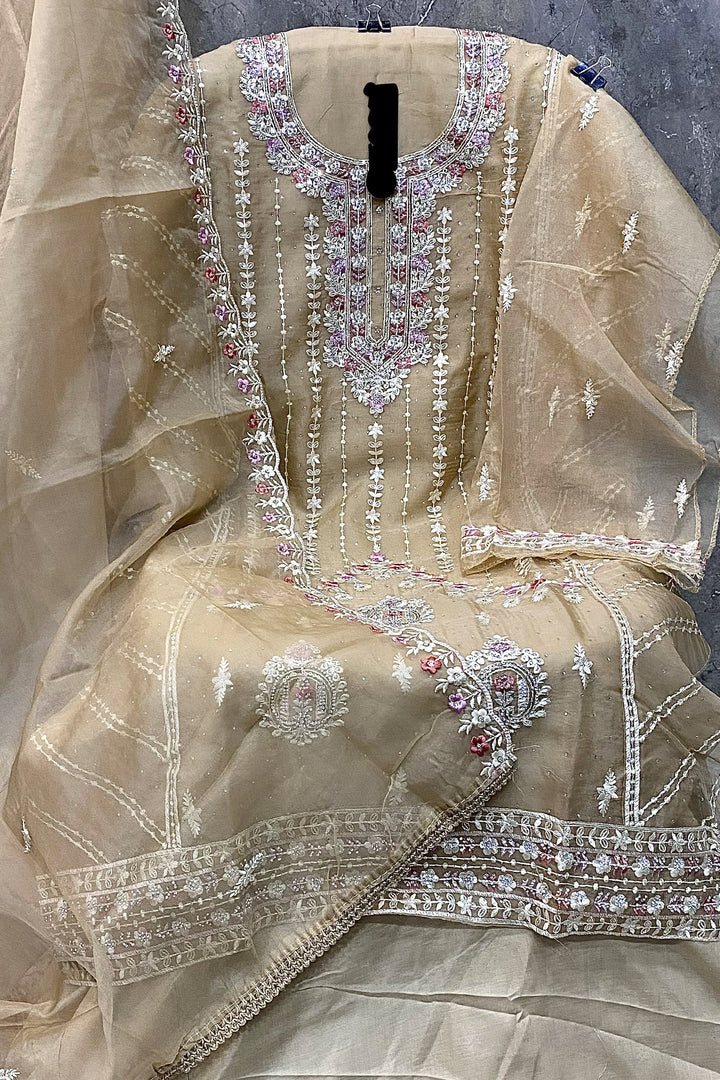 Premium Chiku Pakistani Organza Khatli Work Salwar Kameez With Organza Dupatta Embroidery