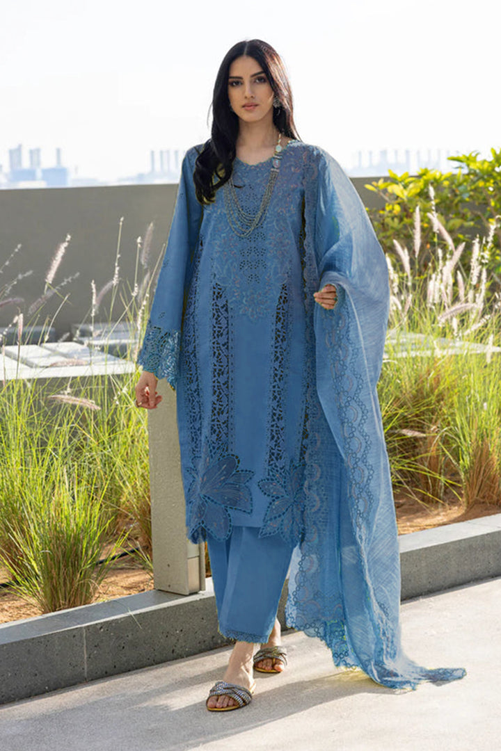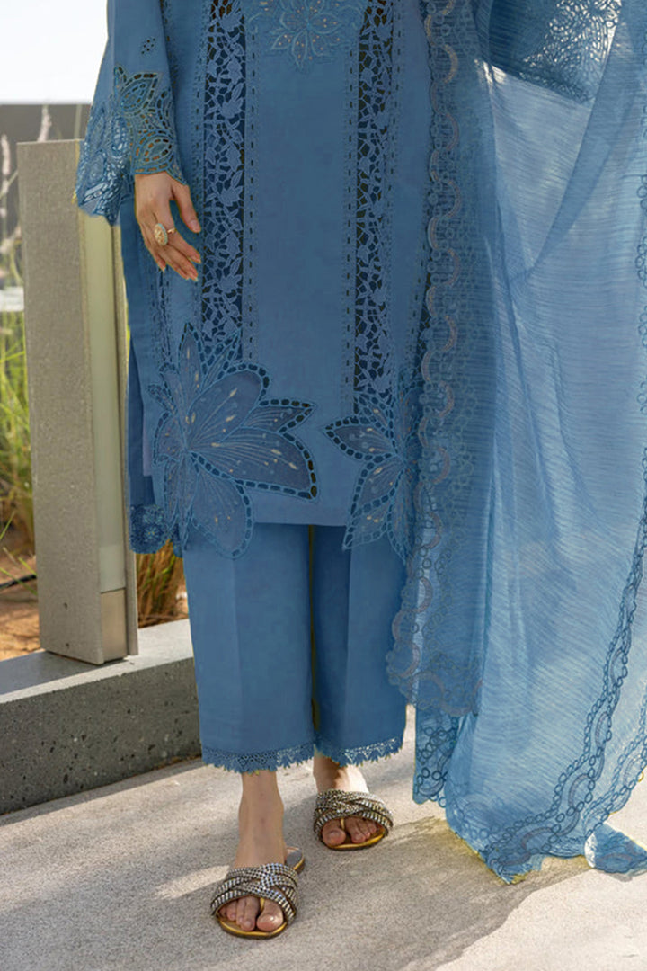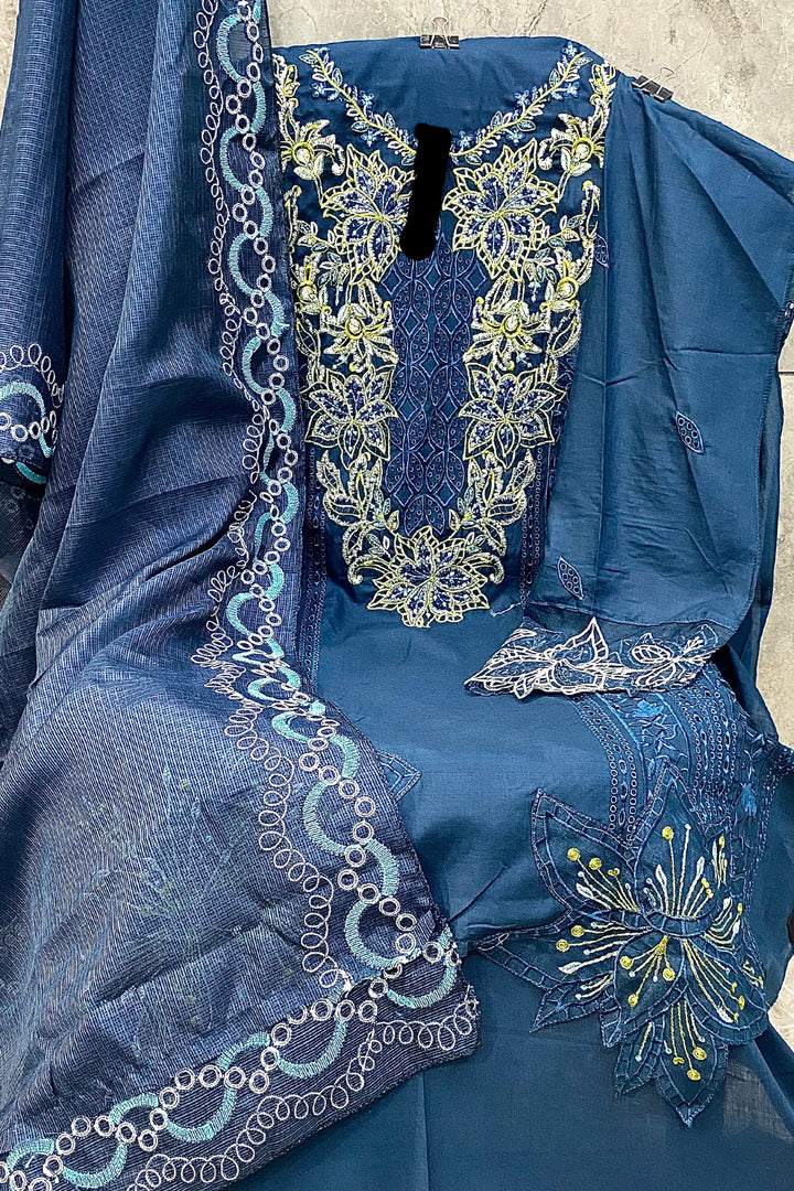 This Rama blue Pakistani salwar kameez features detailed embroidery and includes a beautiful imported Chex dupatta for a refined traditional look.