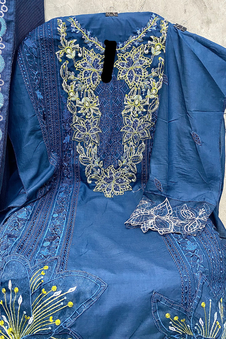 Rama Blue Embroidered Pakistani Salwar Kameez With Beautiful Imported Chex Dupatta