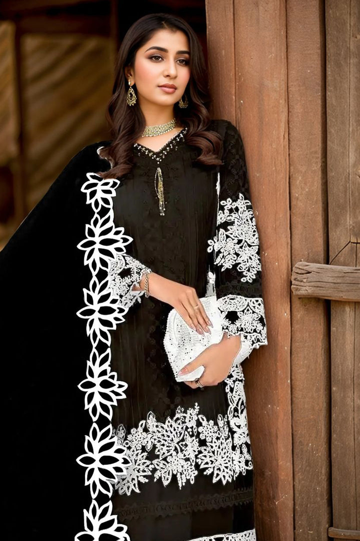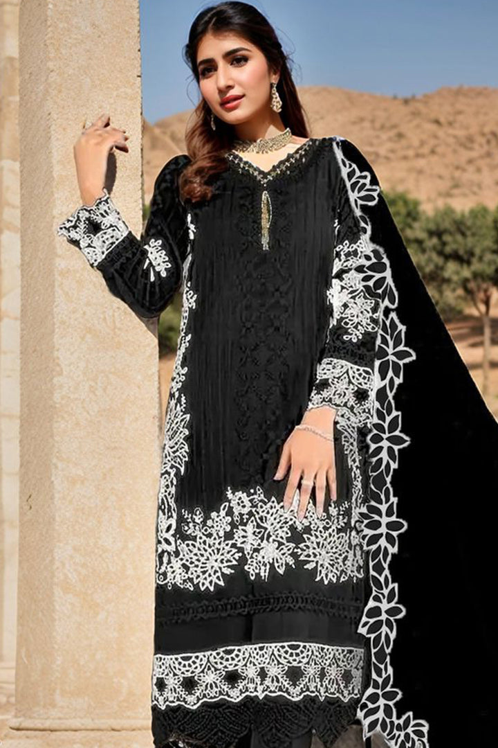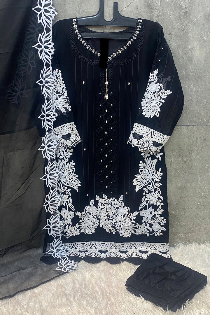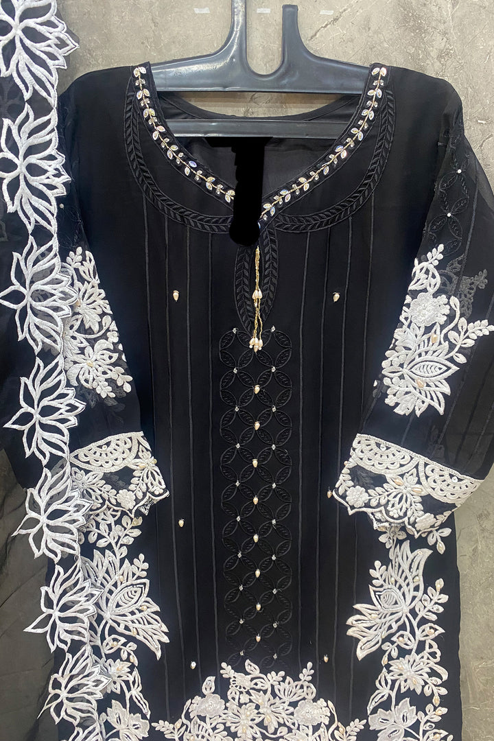 This black Pakistani salwar kameez features floral embroidery and comes with a sheer organza dupatta, offering a stylish and ready-to-wear traditional outfit.