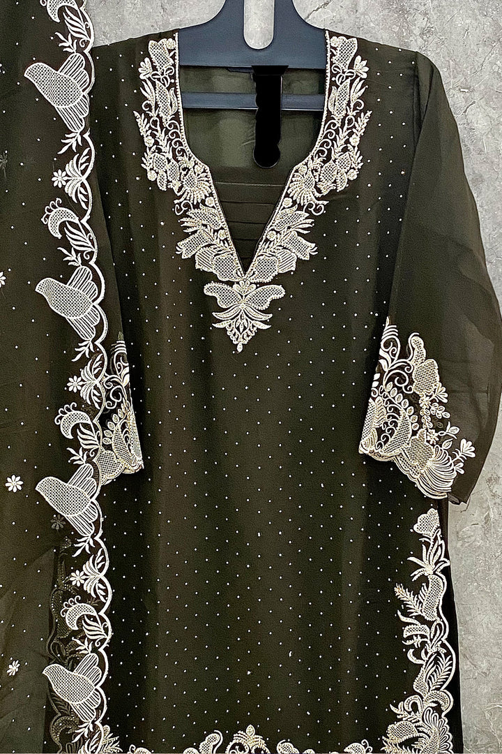 This ready-to-wear Pakistani salwar kameez set features festive mehndi georgette fabric with a matching georgette dupatta, perfect for traditional occasions.