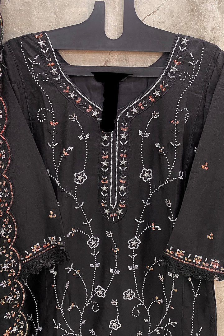 This ready-to-wear Pakistani salwar kameez features a black faux georgette fabric adorned with intricate star coding work, complemented by a matching dupatta with detailed embroidery. Designed for elegance and comfort, it offers a refined traditional look with expert craftsmanship.