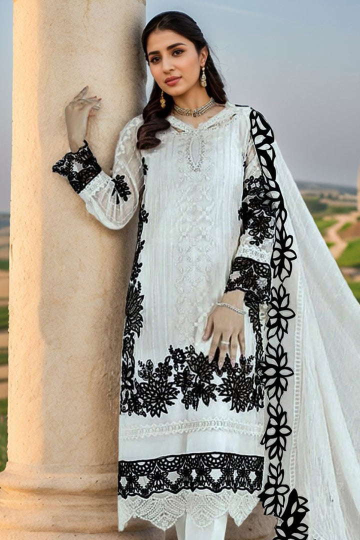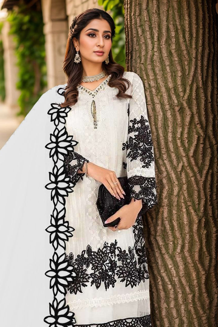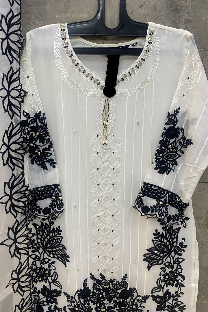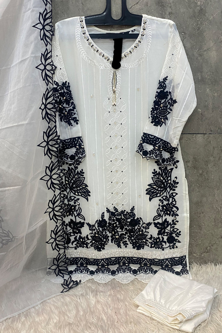 Ready To Wear White Floral Embroidered Pakistani Salwar Kameez With Organza Dupatta