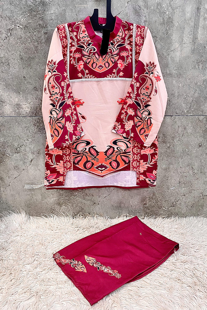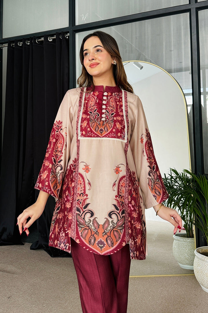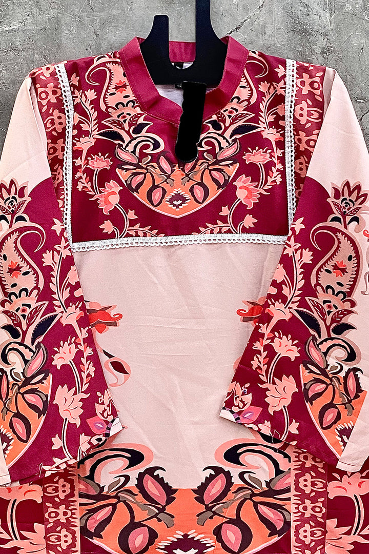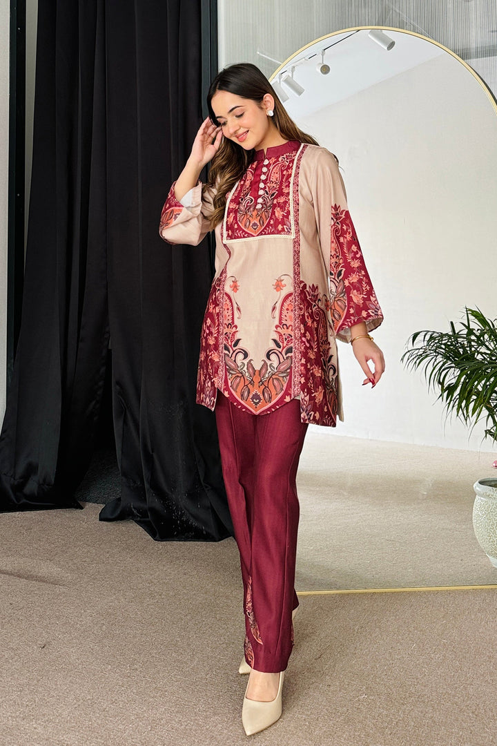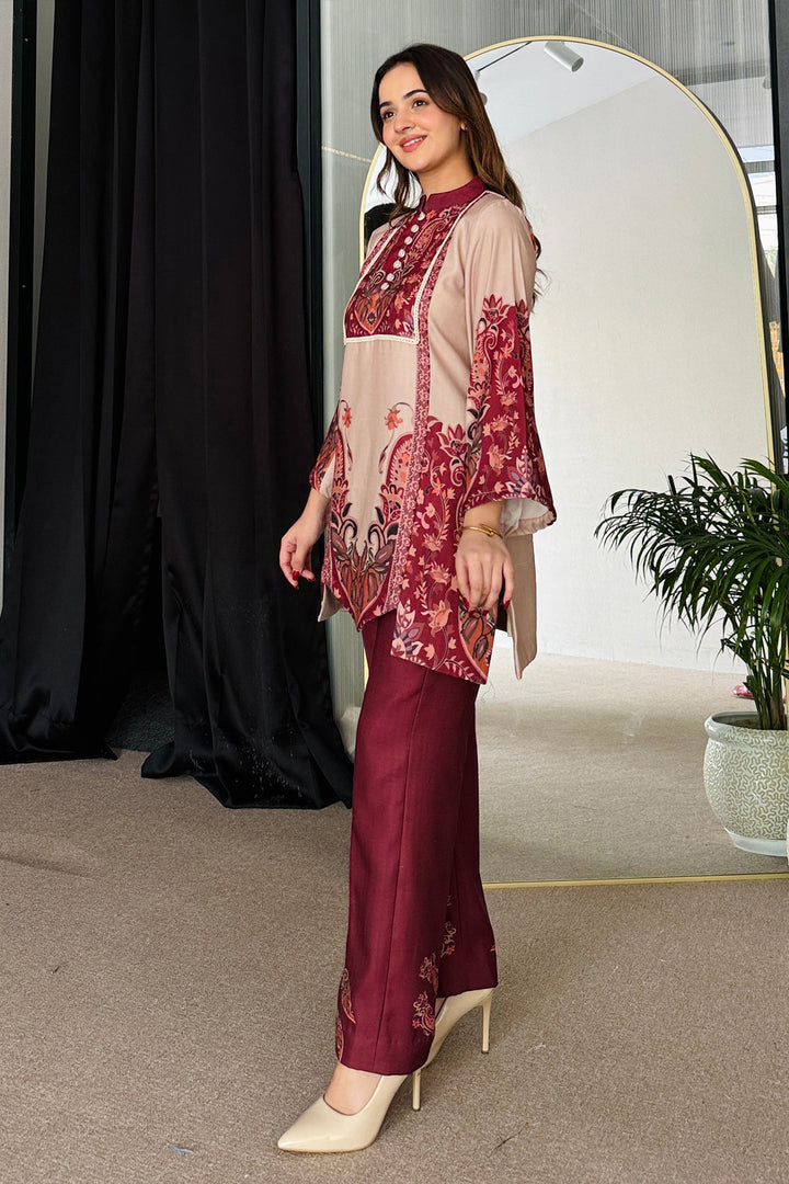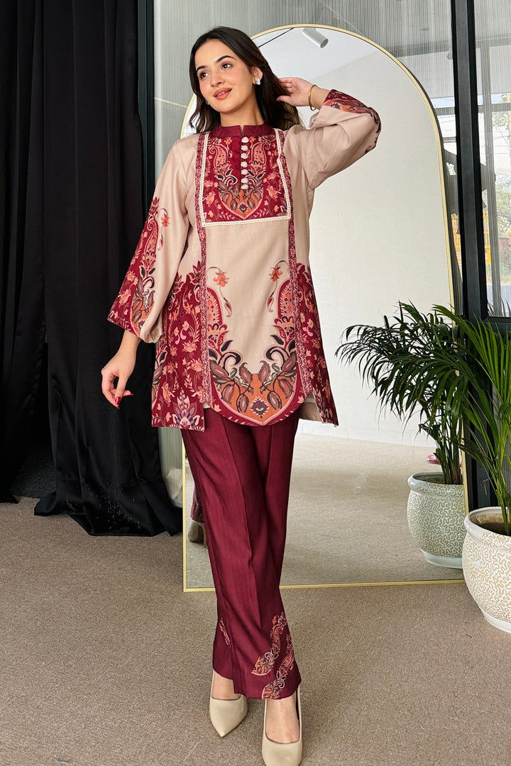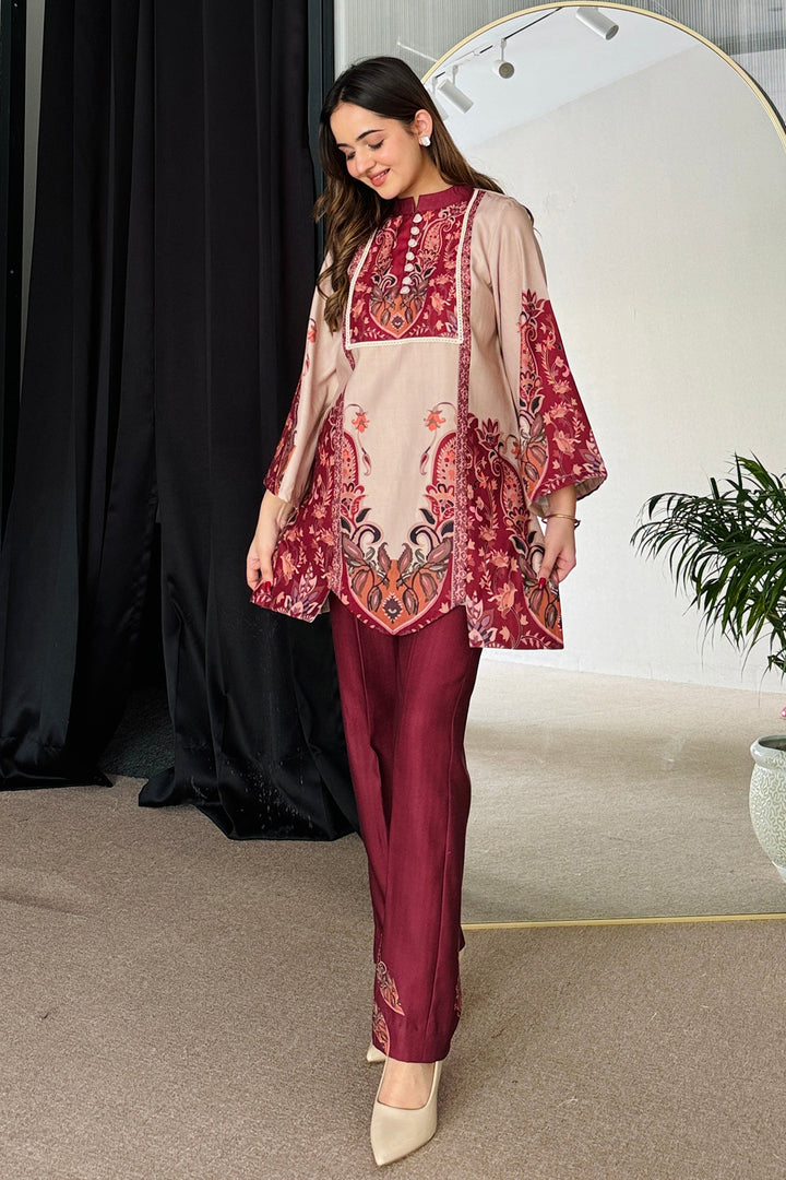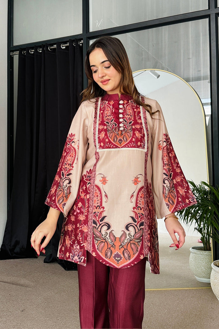 This ready-to-wear co-ord set features a dark cream and maroon floral print on soft Pakistani rayon satin. It includes a top and palazzo pants, offering comfort and elegant style.