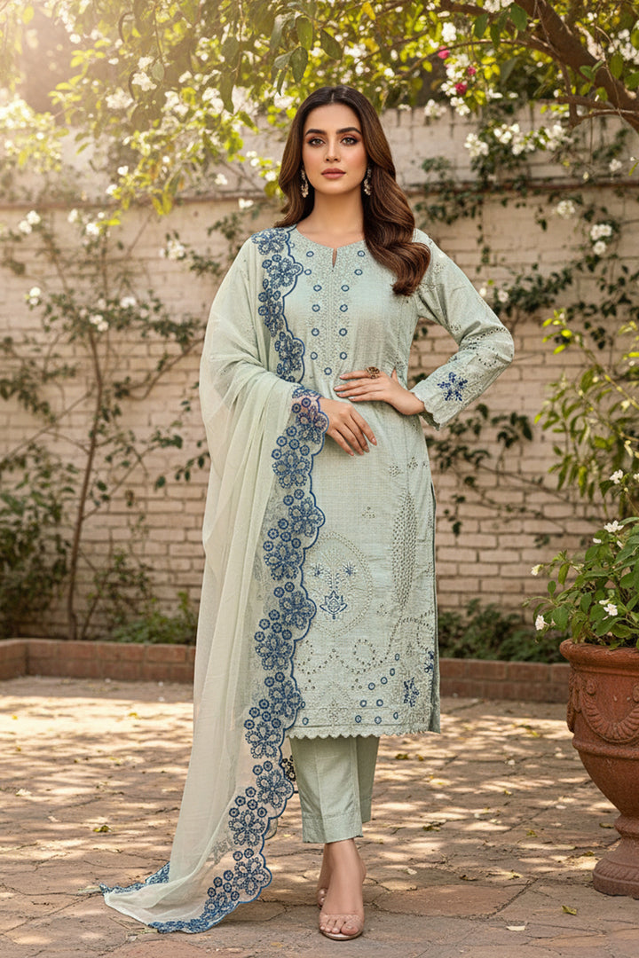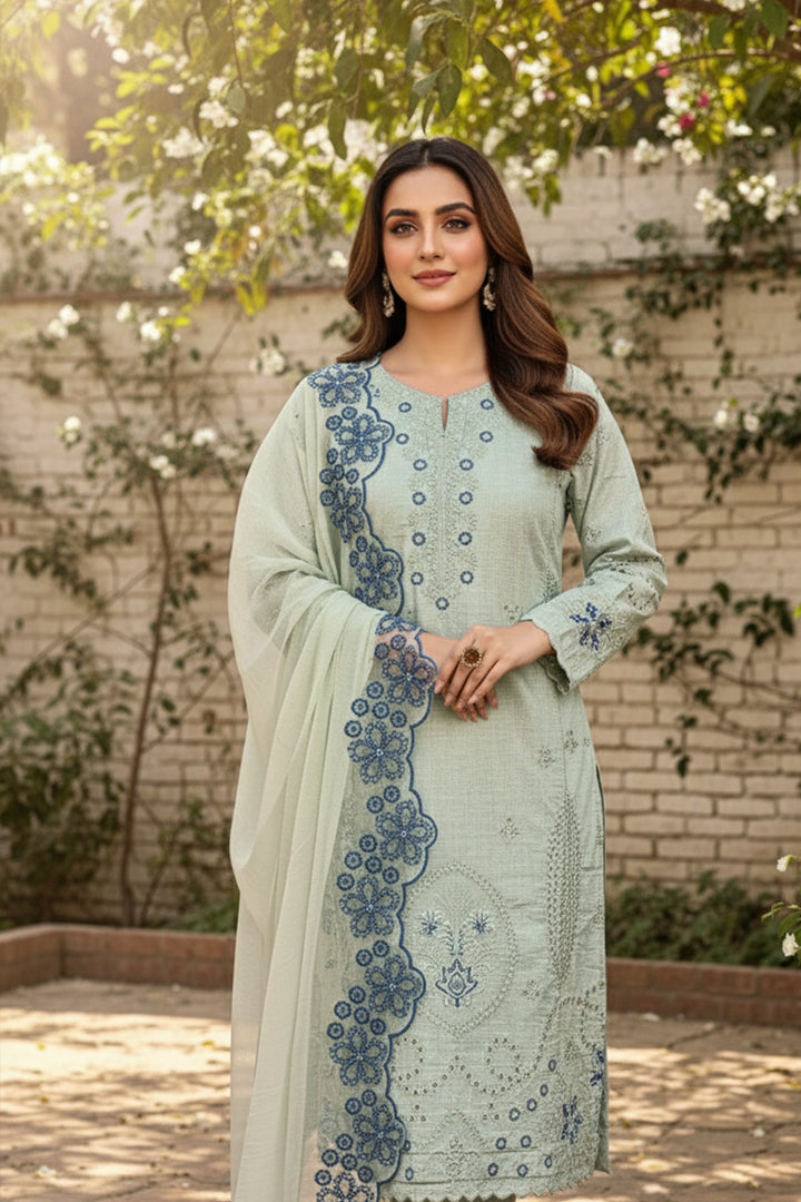 Elegant readymade salwar kameez crafted from premium crystal viscose in a soft pista shade. Features a coordinating organza dupatta for a refined, polished look. Perfect for festive occasions and celebrations.