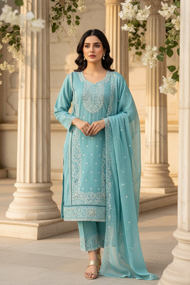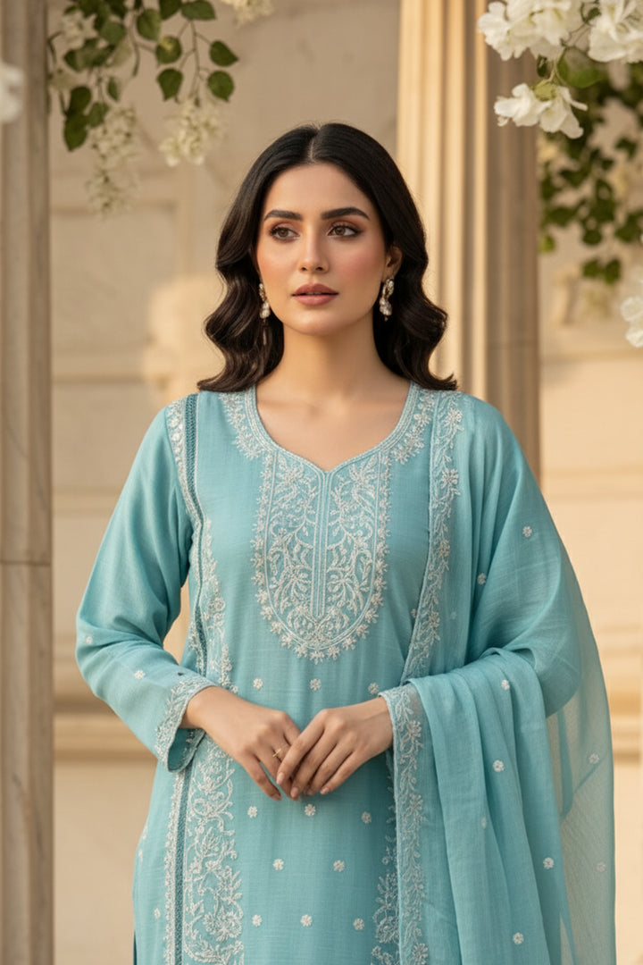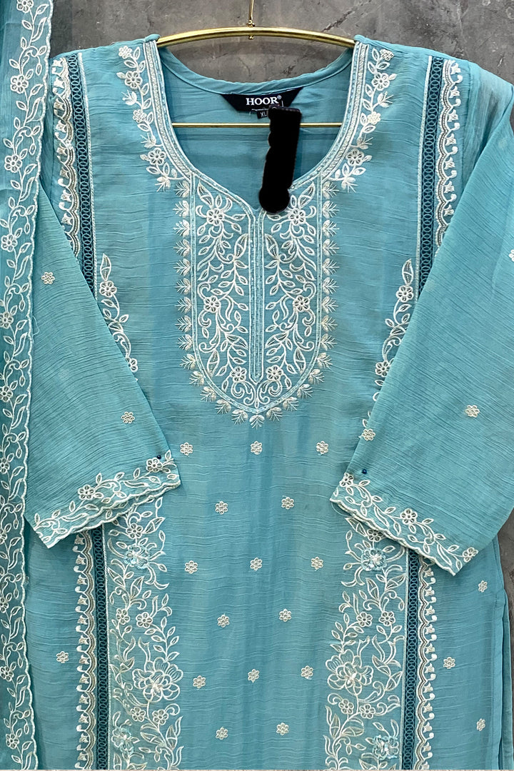This ready-to-wear Pakistani salwar kameez features a light sky color and is made from heavy chiffon fabric. It includes a matching chiffon dupatta, offering a comfortable and elegant outfit for any occasion.