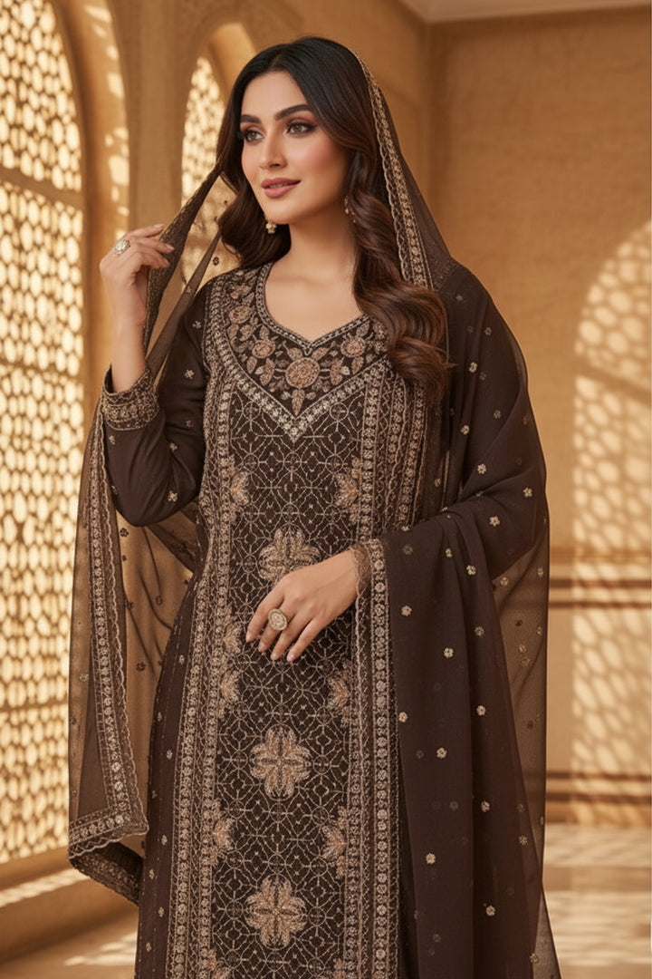 This ready-to-wear luxury Coffy Georgette Pakistani salwar kameez features intricate embroidery and comes with a matching georgette dupatta, combining elegance with comfort.