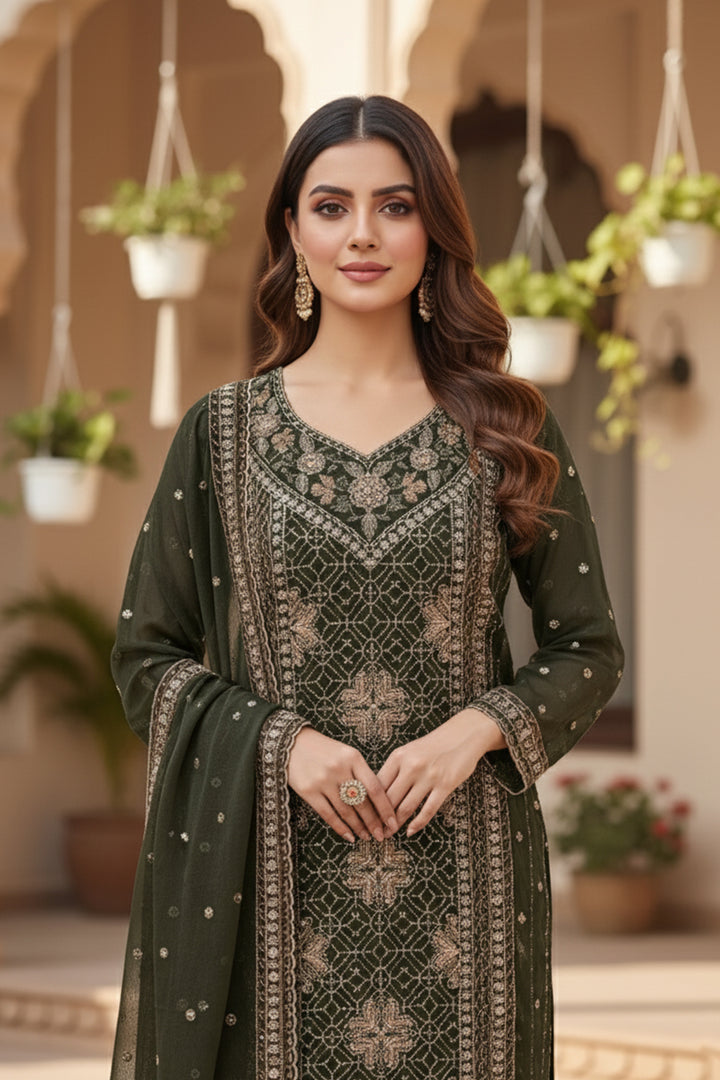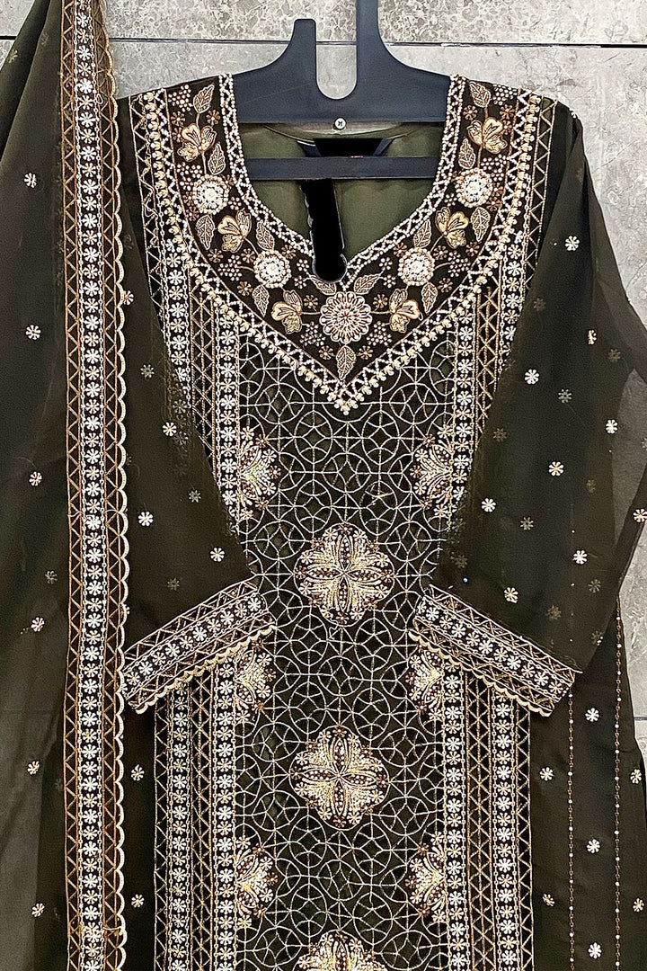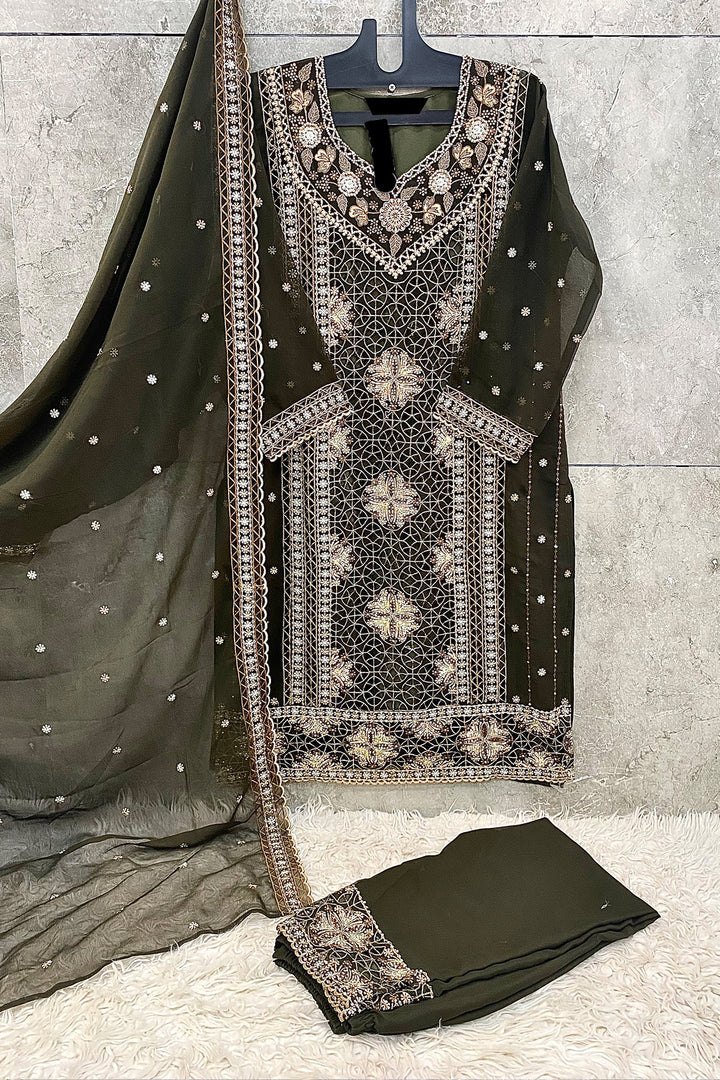 Readymade Luxury Mehndi Georgette Pakistani Salwar Kameez Embroidered Suit With Georgette Dupatta