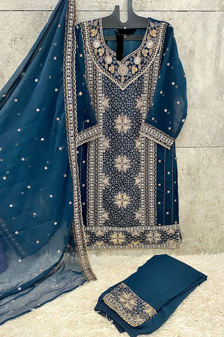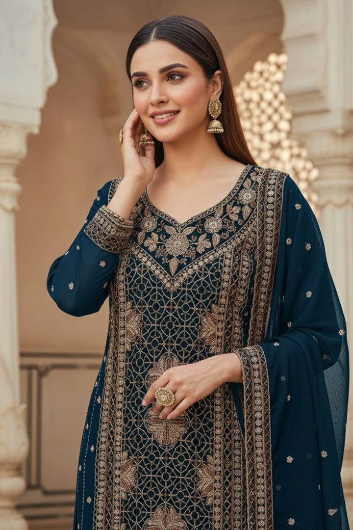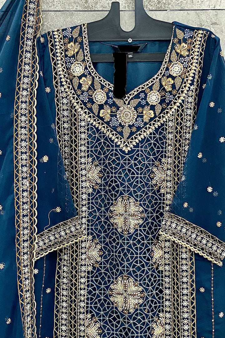 This navy blue georgette Pakistani salwar kameez features elegant embroidery and comes with a matching georgette dupatta, offering a ready-to-wear luxurious traditional outfit.