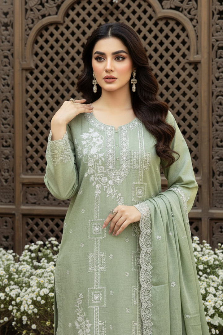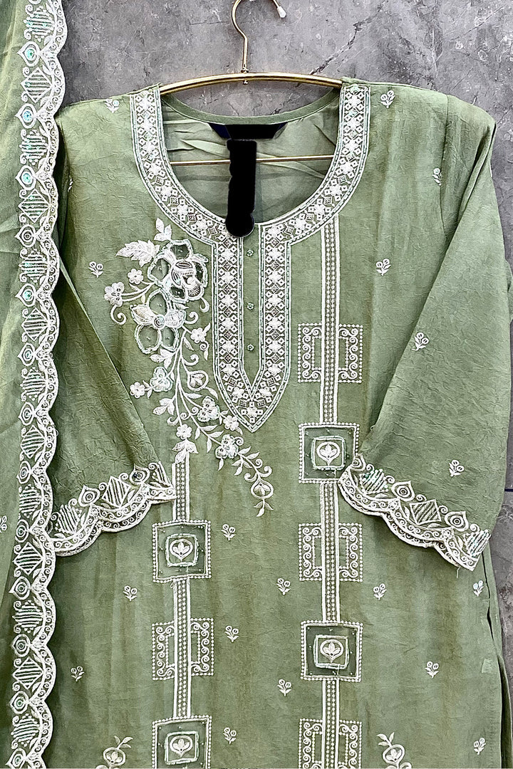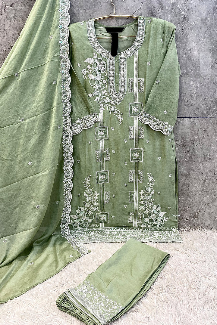 This ready-to-wear Pakistani chiffon salwar kameez features a pista green tunic adorned with delicate pearl work and comes with a matching chiffon dupatta, offering elegance and comfort in one set.