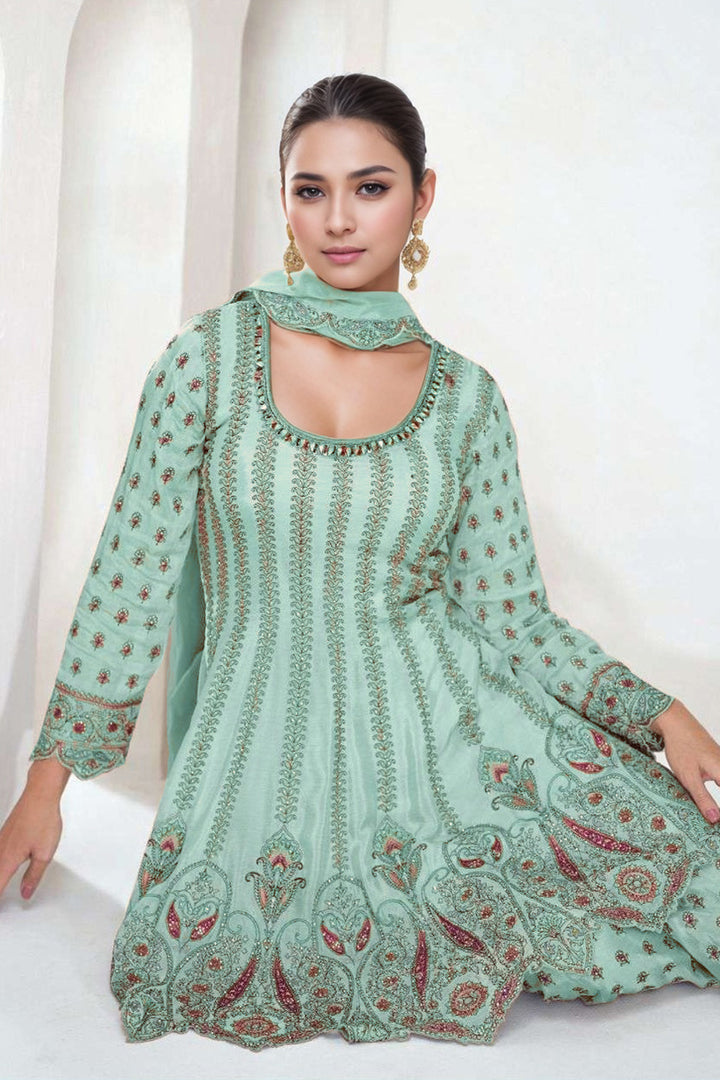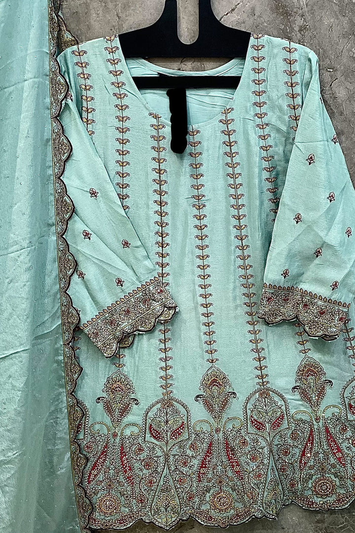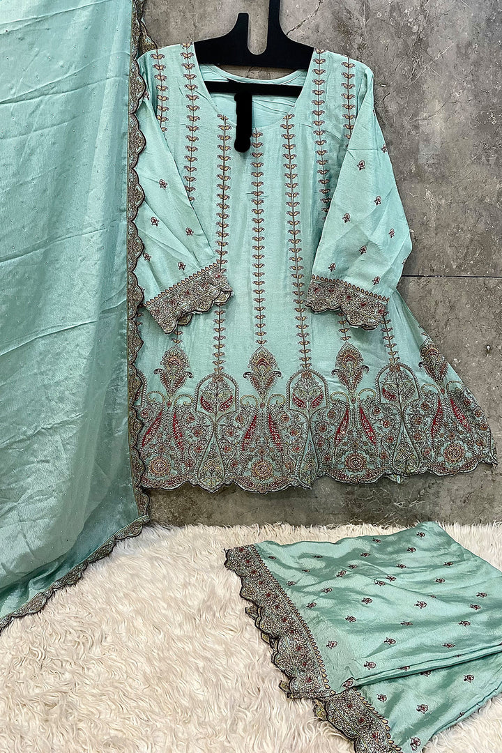 This pista green Pakistani-style salwar suit is ready to wear, featuring detailed embroidery and paired with palazzo pants and a matching dupatta for a complete traditional outfit.