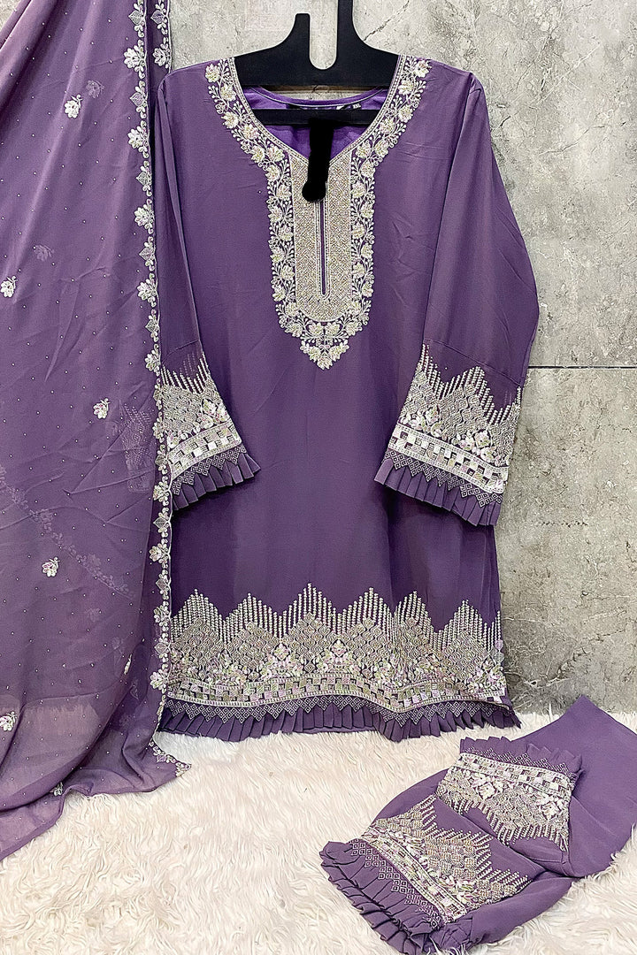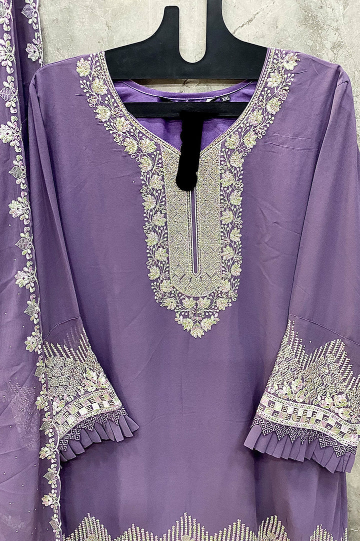 Elegant purple georgette Pakistani salwar kameez with embroidered dupatta, ready to wear for parties.