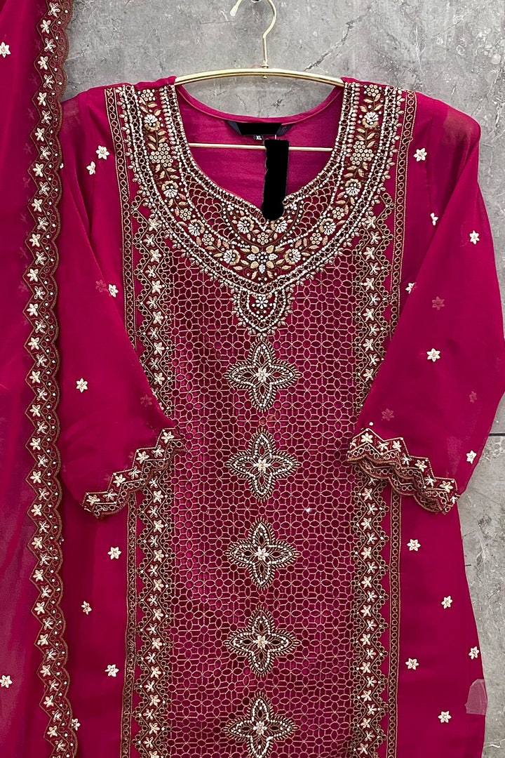This ready-to-wear red georgette Pakistani salwar kameez set includes a matching georgette dupatta, perfect for weddings and special occasions. Its comfortable fabric and vibrant color offer elegance with ease.