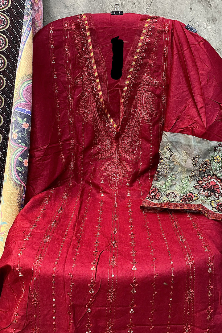 This maroon Pakistani rayon suit features elegant embroidery, paired with an ornate multicolor dupatta and delicate lace detailing for a sophisticated look.