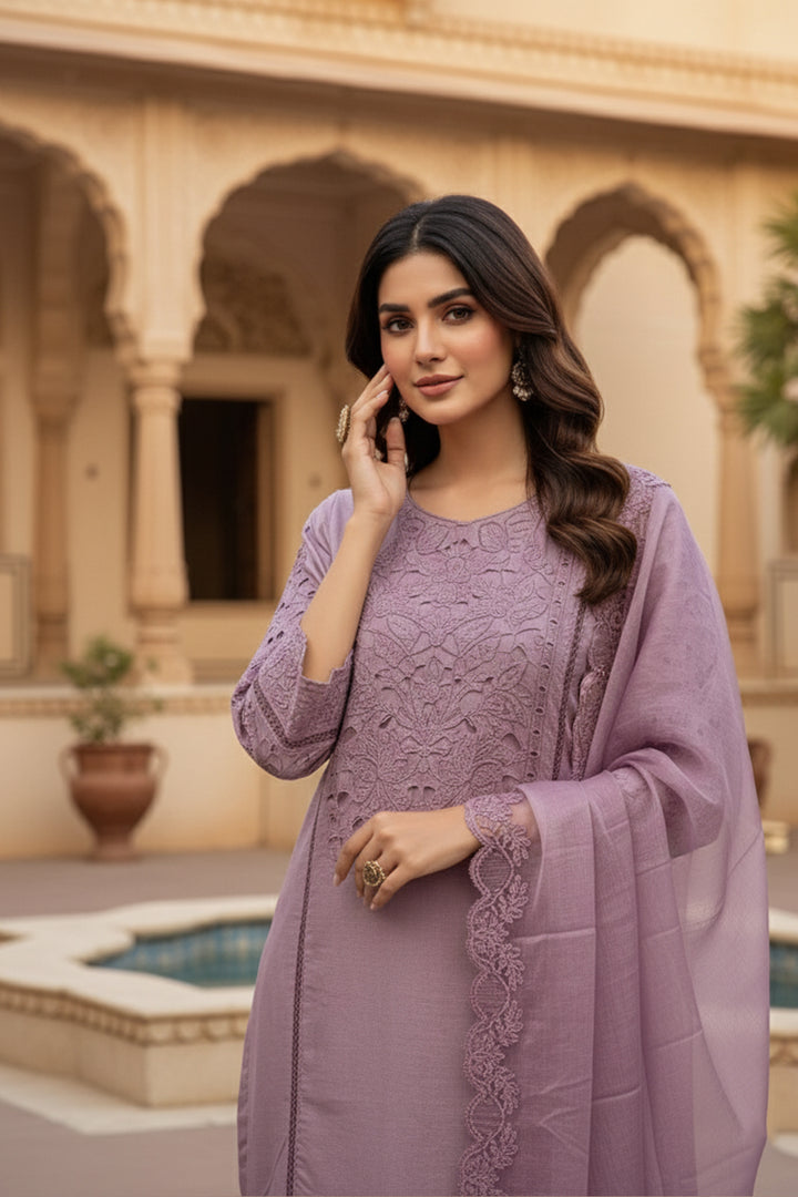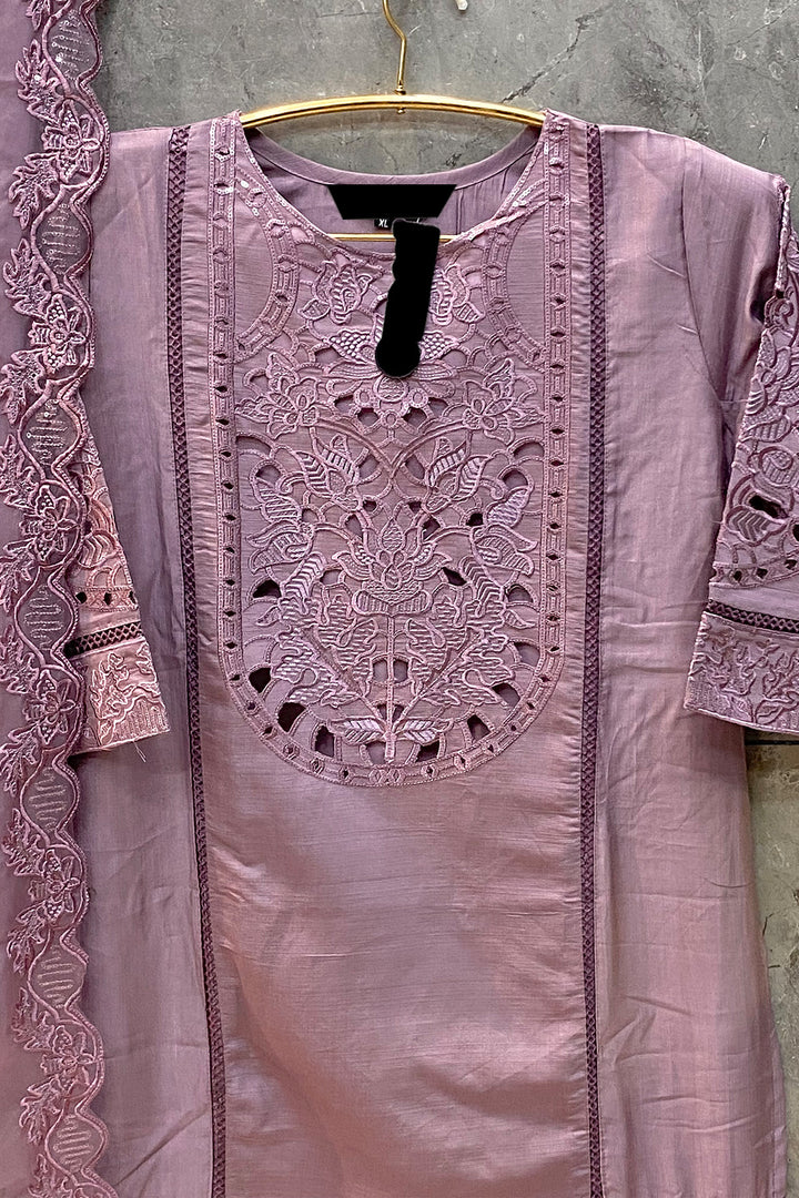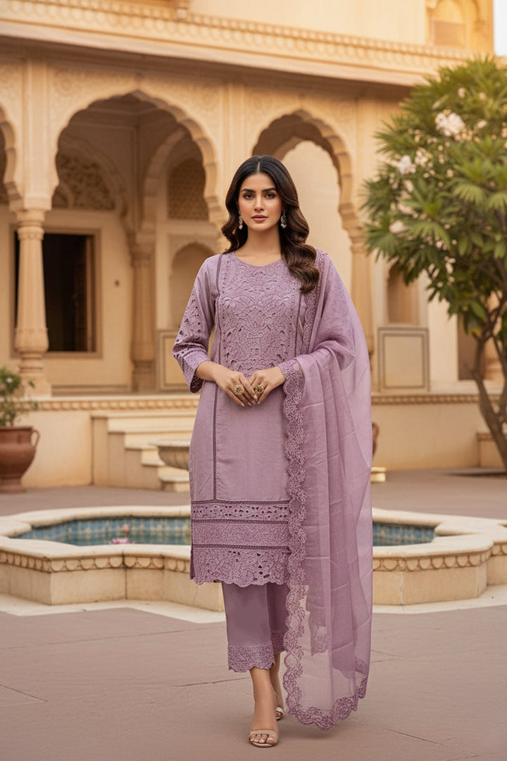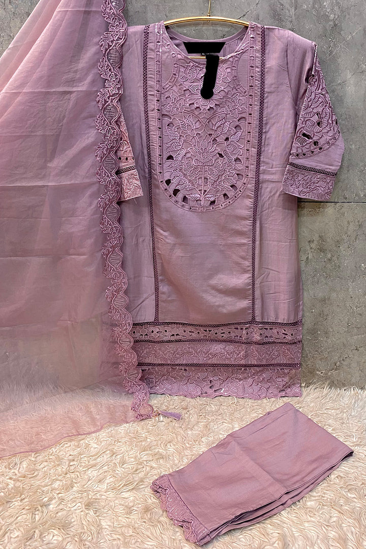 Stitched Classy Dusty Purple Crystal Embellished Viscose Pakistani Salwar Kameez With Organza Dupatta