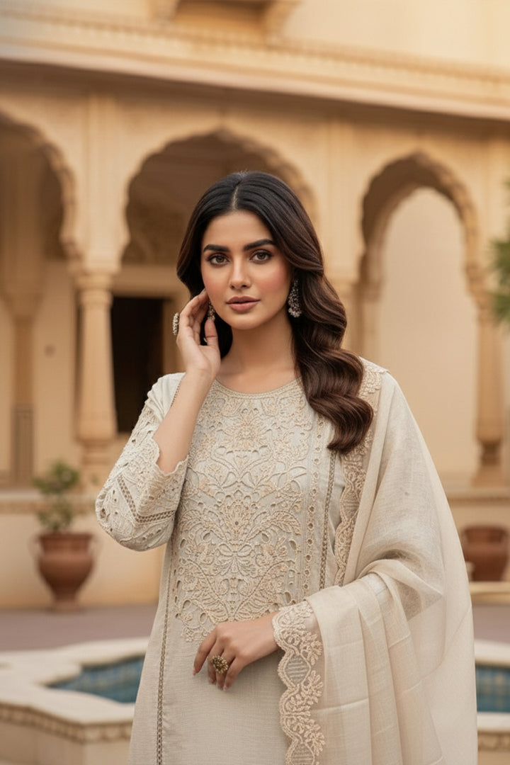 This cream viscose Salwar Kameez features delicate crystal embellishments and comes with a lightweight organza dupatta, offering a comfortable and elegant traditional look.