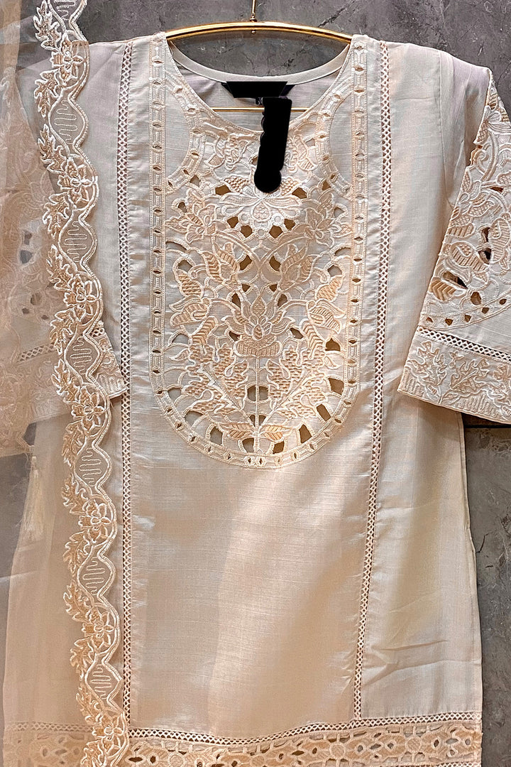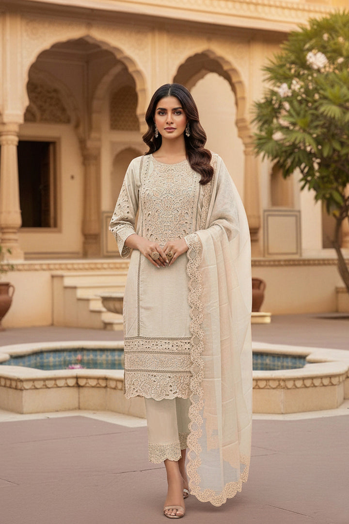 Stitched Pretty Cream Crystal Embellished Viscose Pakistani Salwar Kameez With Organza Dupatta