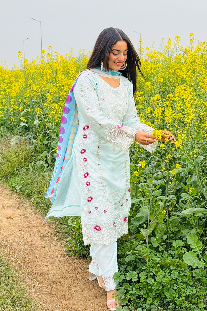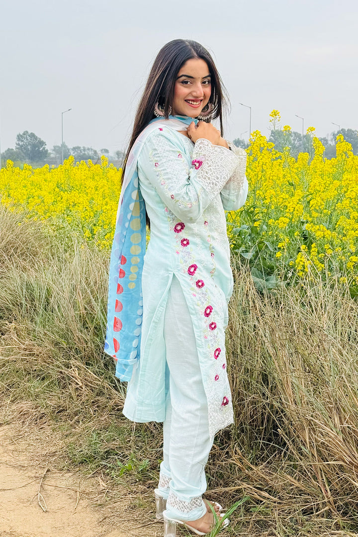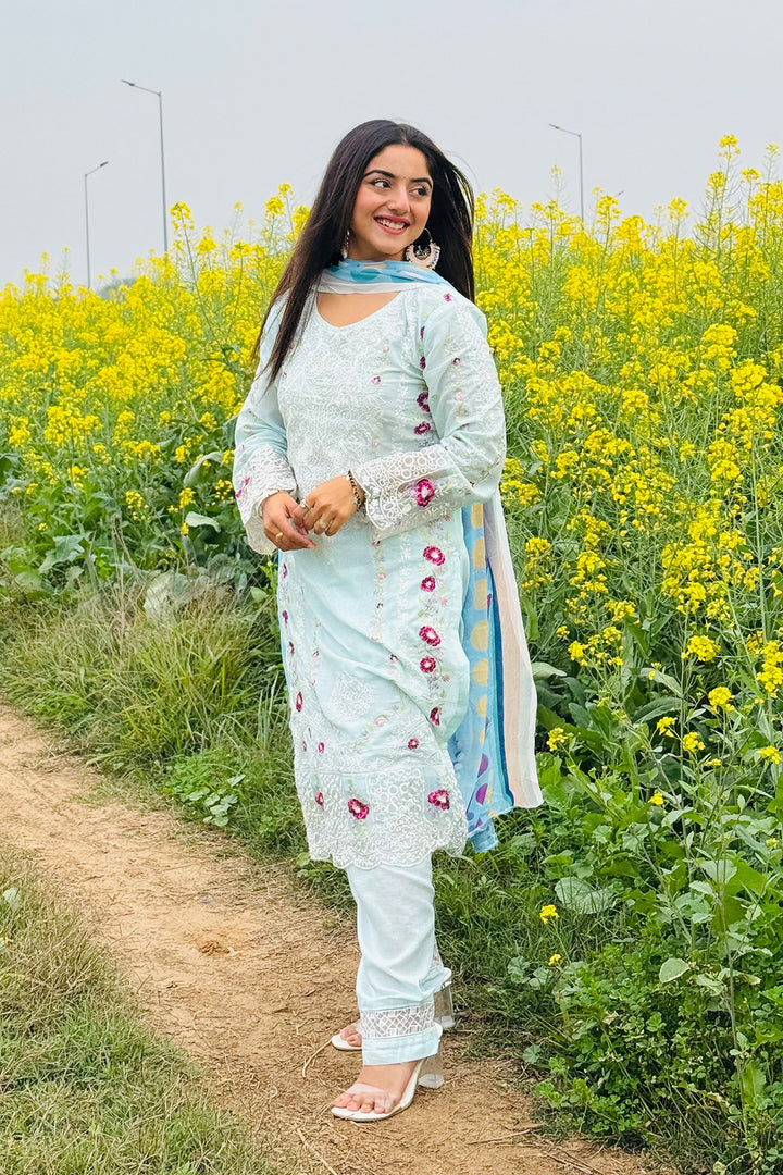 This sky blue Pakistani salwar kameez is made of comfortable cotton and comes with a beautiful Nazneen dupatta, perfect for elegant and breathable wear.